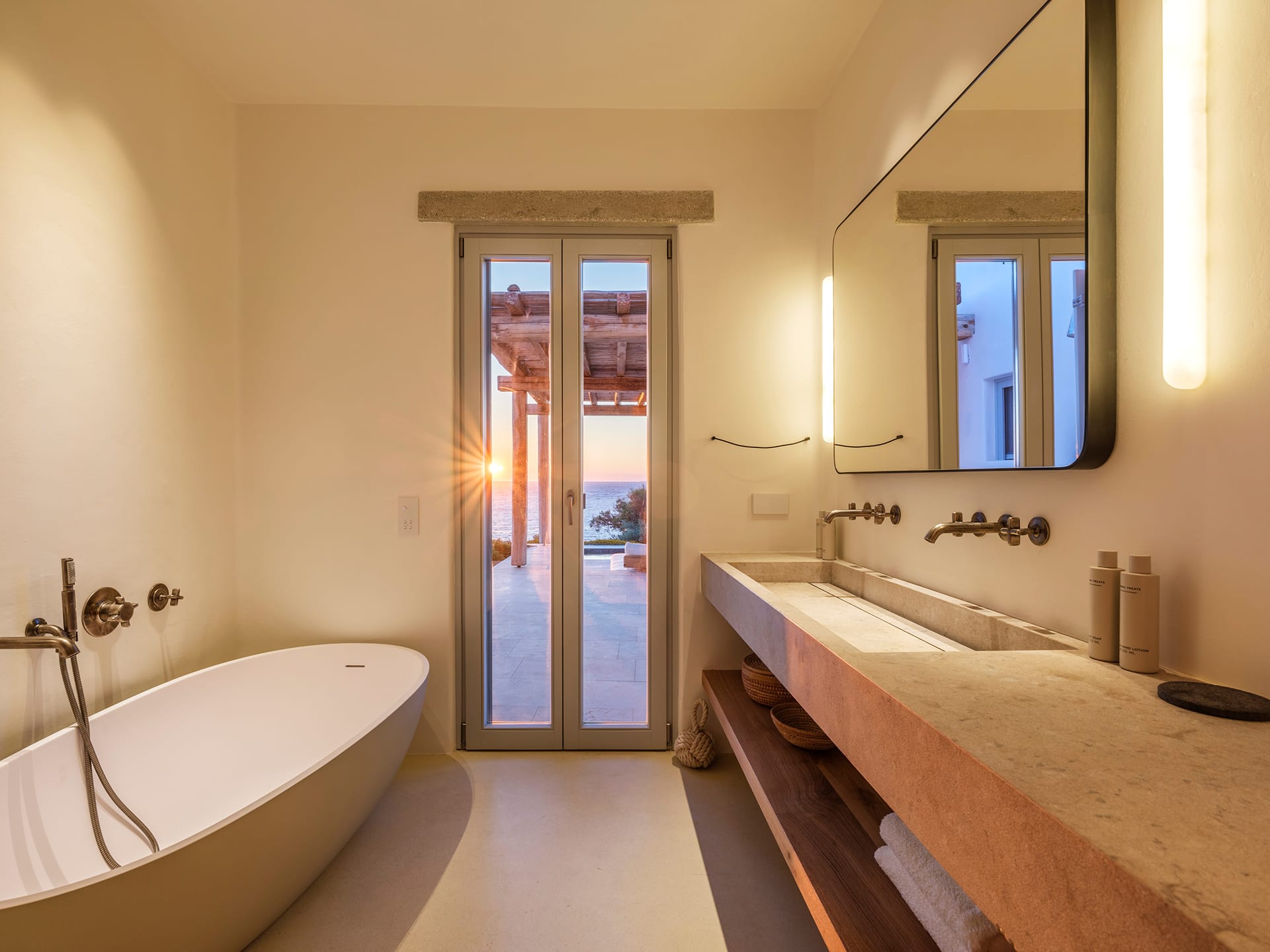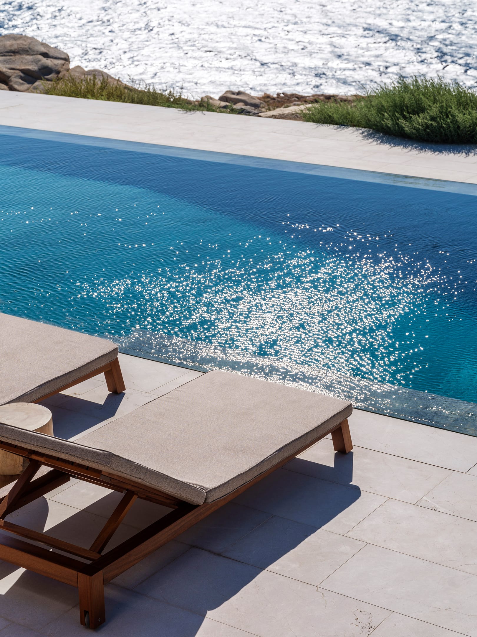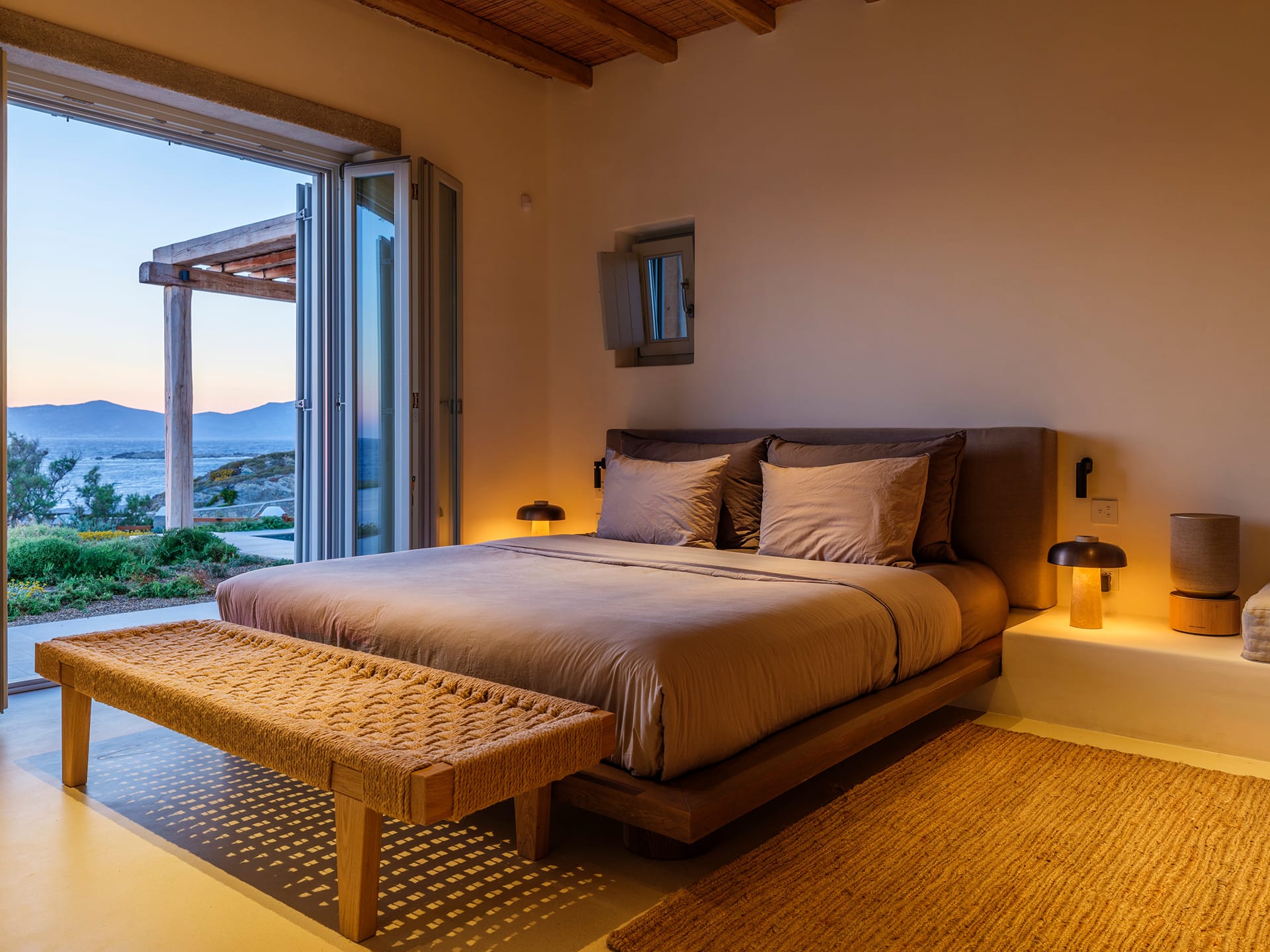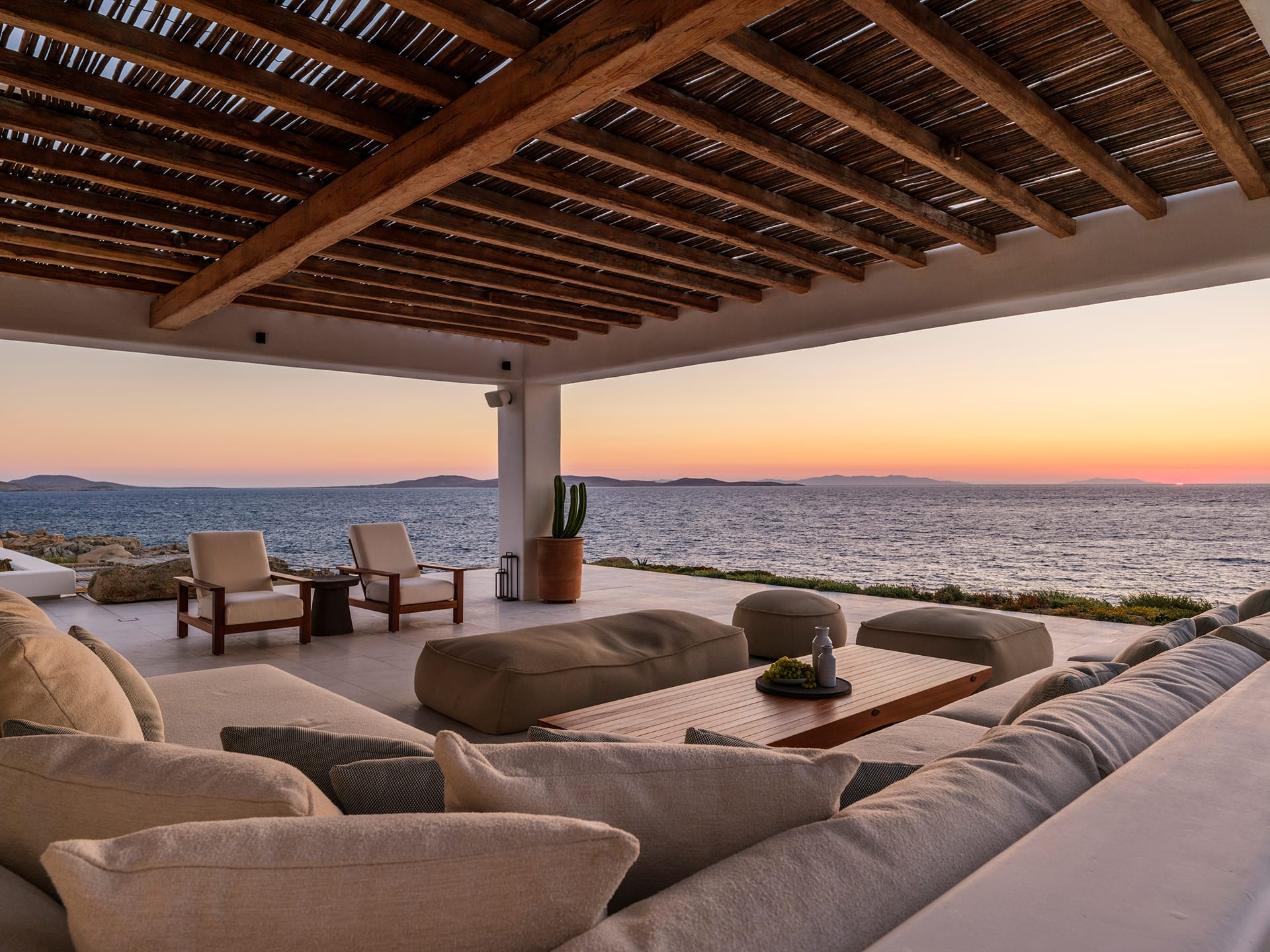 Designed with timeless Greek aesthetics, Villa Rosa blends natural materials, whitewashed lines, and bright, open living spaces. Spacious terraces, warm textures, and abundant natural light create a serene environment perfect for relaxation and alfresco living. At sunset, the villa becomes a sanctuary of calm, ideal for poolside lounging or outdoor dining with breathtaking Aegean views.