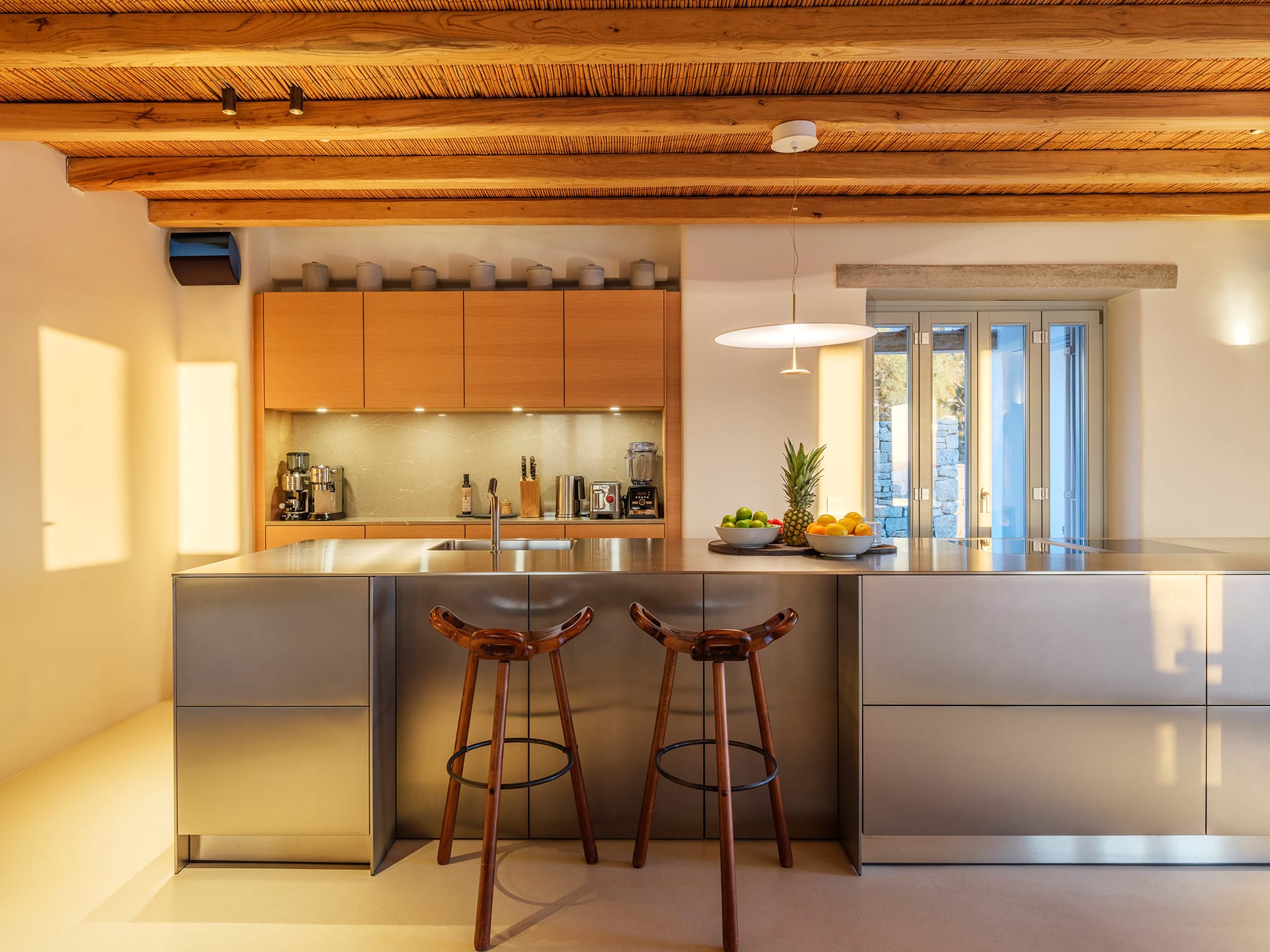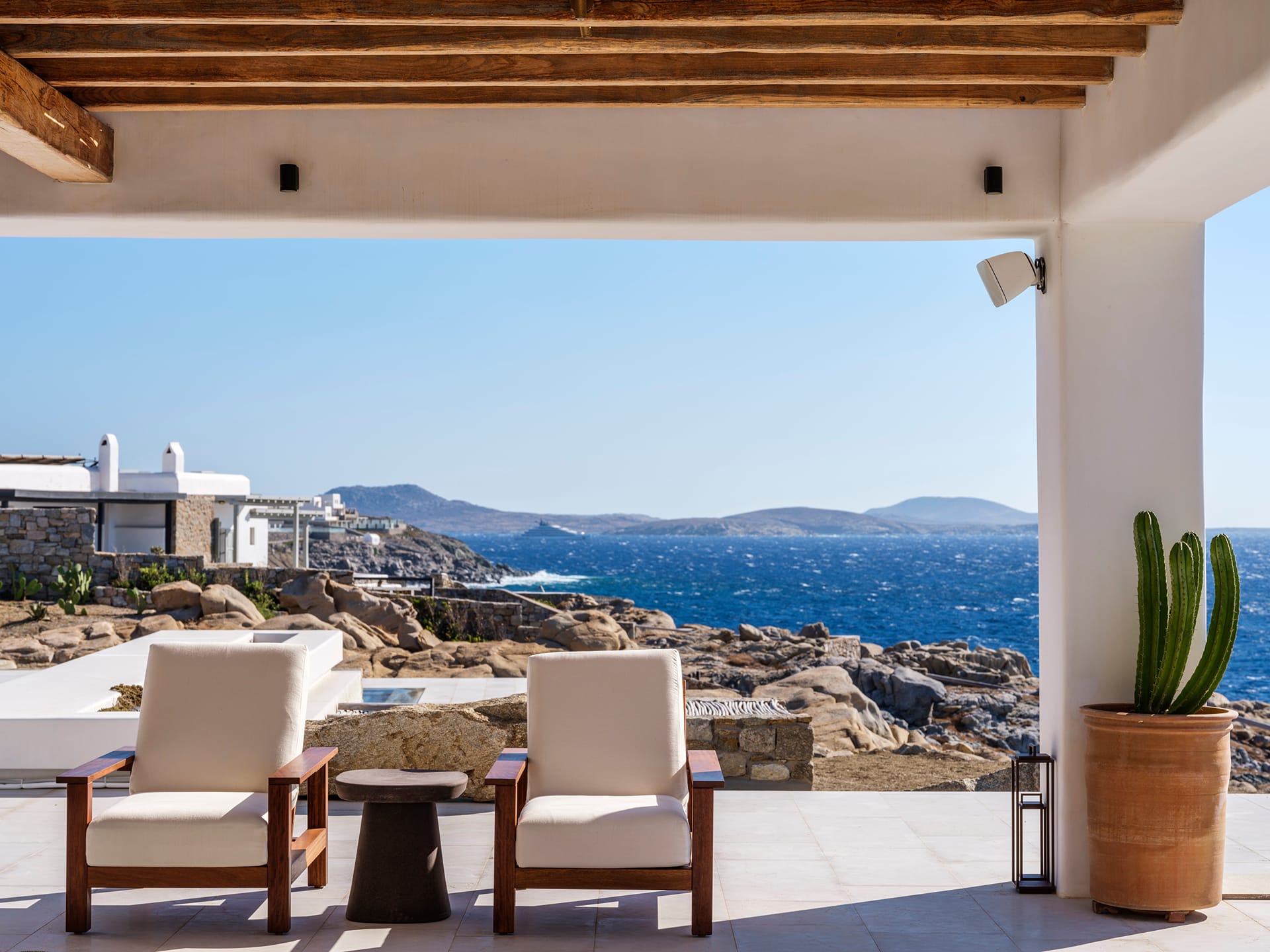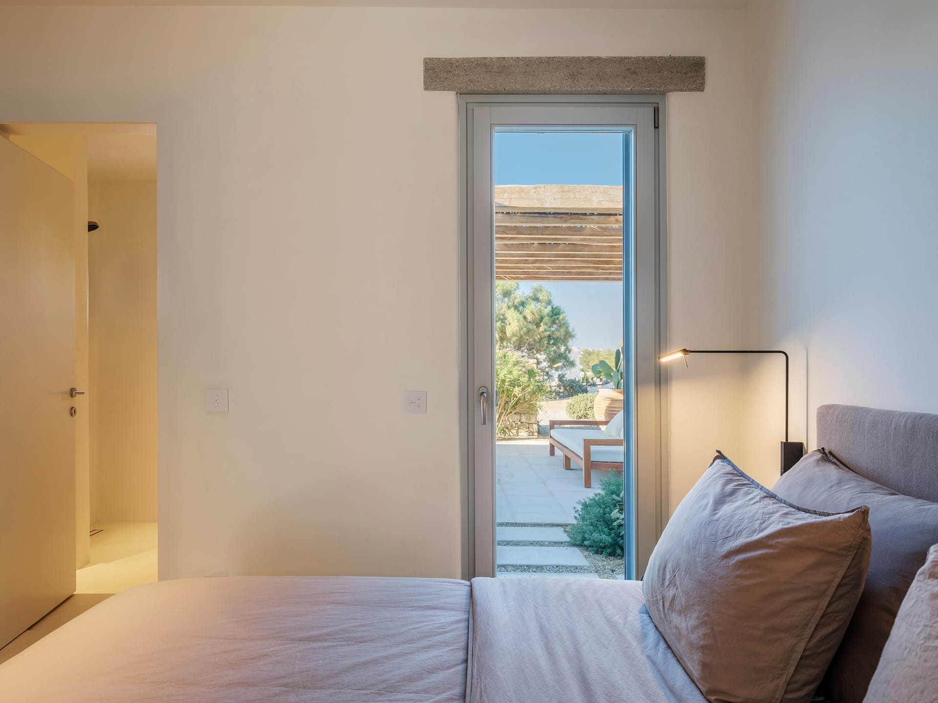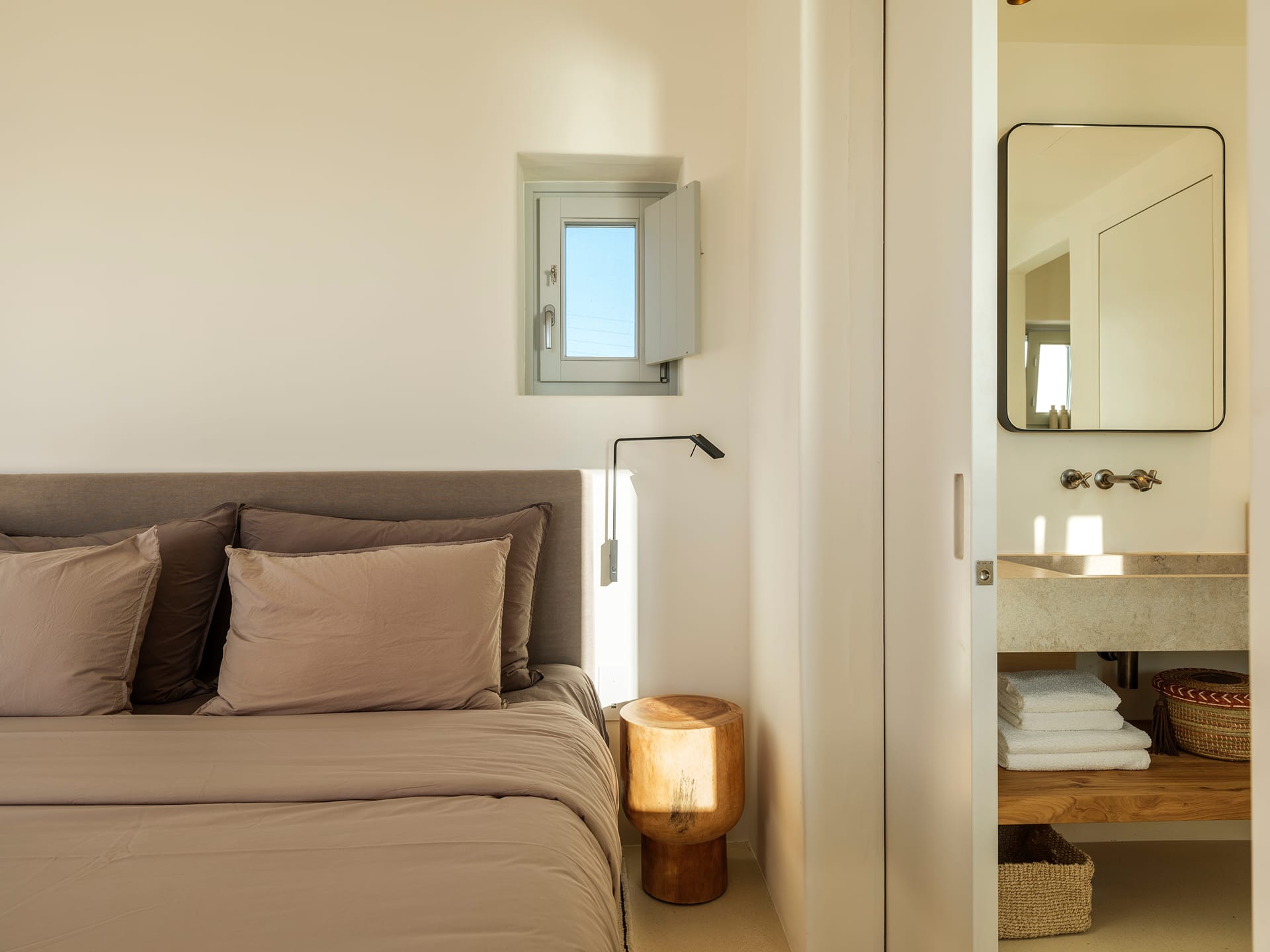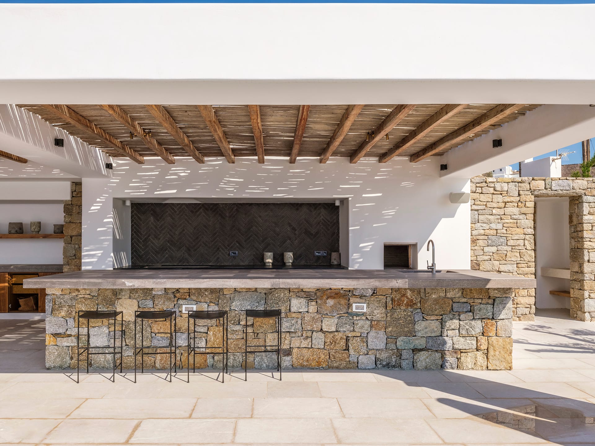 Designed with timeless Greek aesthetics, Villa Rosa blends natural materials, whitewashed lines, and bright, open living spaces. Spacious terraces, warm textures, and abundant natural light create a serene environment perfect for relaxation and alfresco living. At sunset, the villa becomes a sanctuary of calm, ideal for poolside lounging or outdoor dining with breathtaking Aegean views.