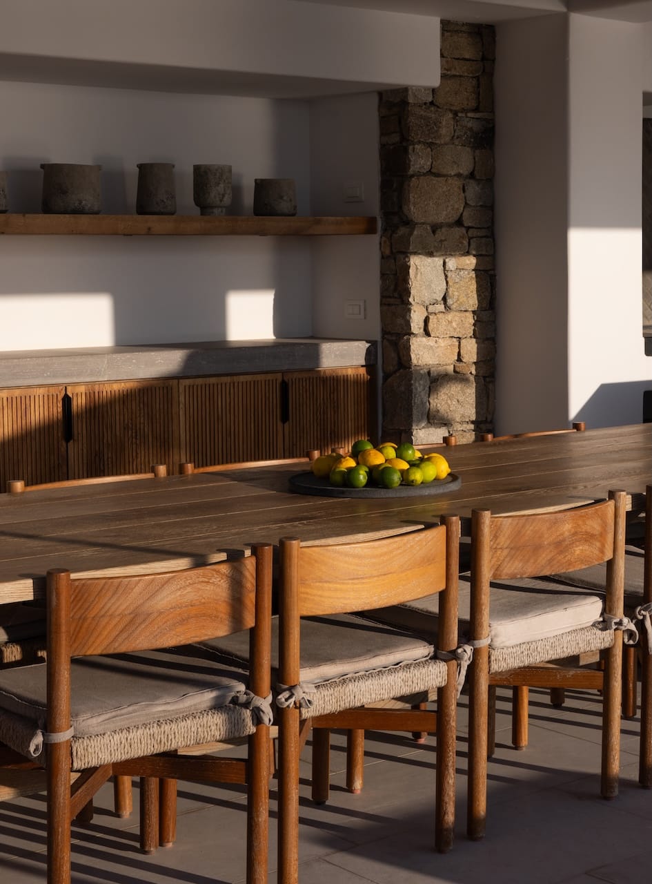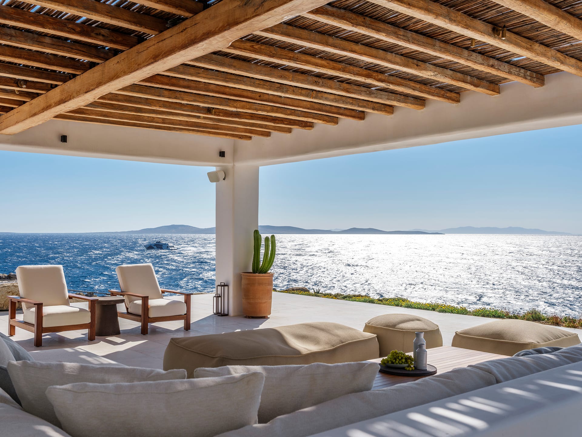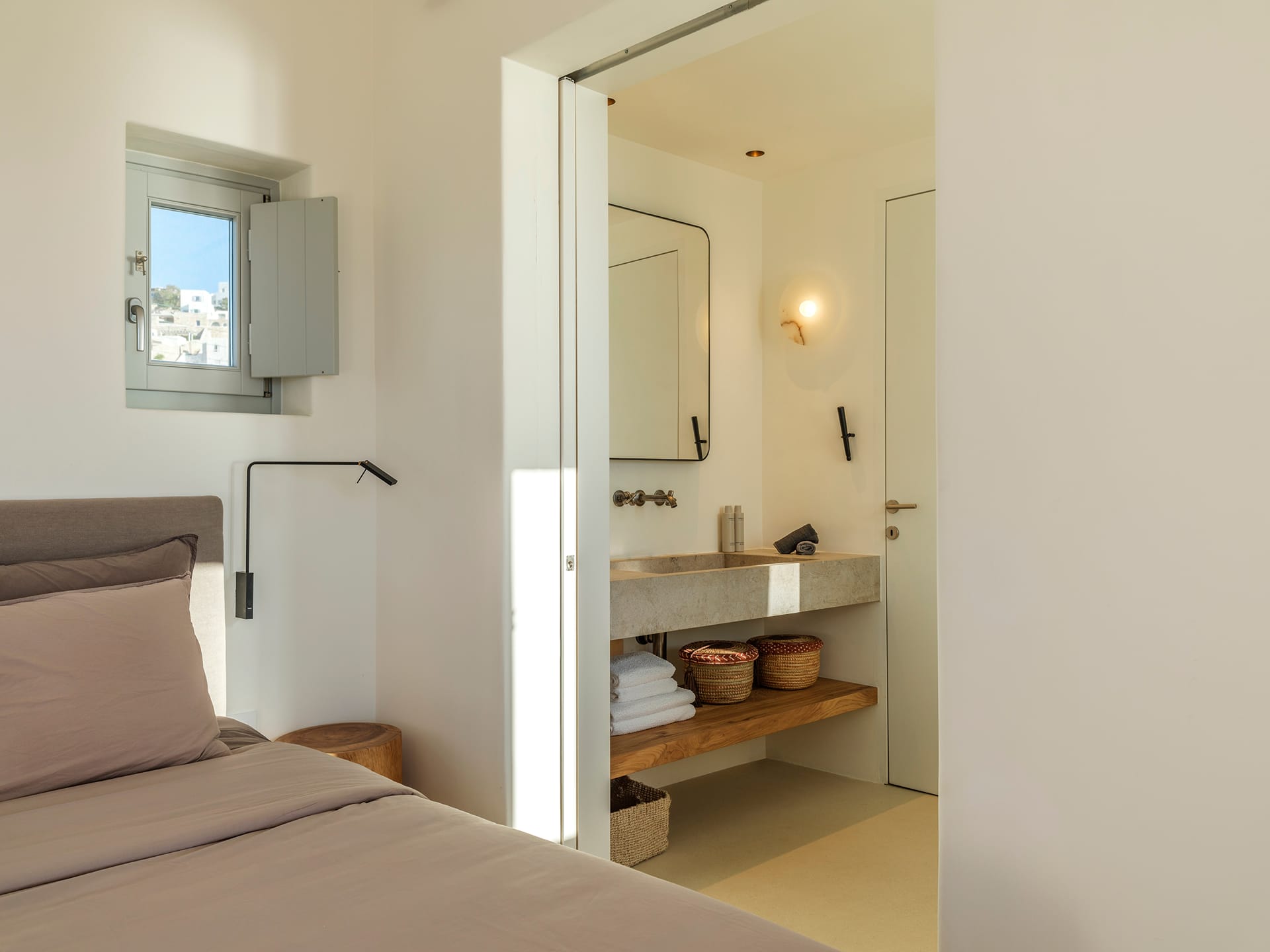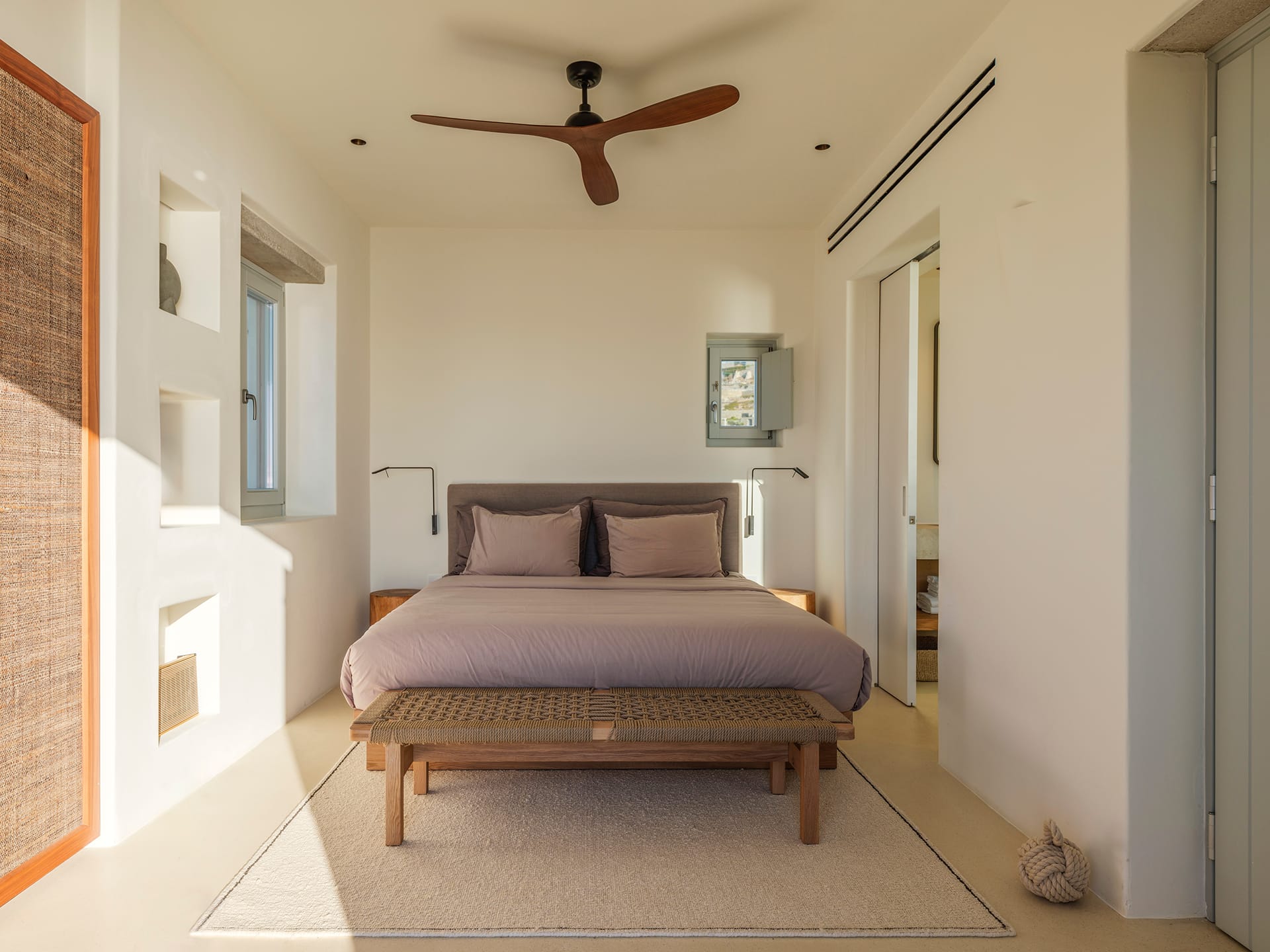 Designed with timeless Greek aesthetics, Villa Rosa blends natural materials, whitewashed lines, and bright, open living spaces. Spacious terraces, warm textures, and abundant natural light create a serene environment perfect for relaxation and alfresco living. At sunset, the villa becomes a sanctuary of calm, ideal for poolside lounging or outdoor dining with breathtaking Aegean views.