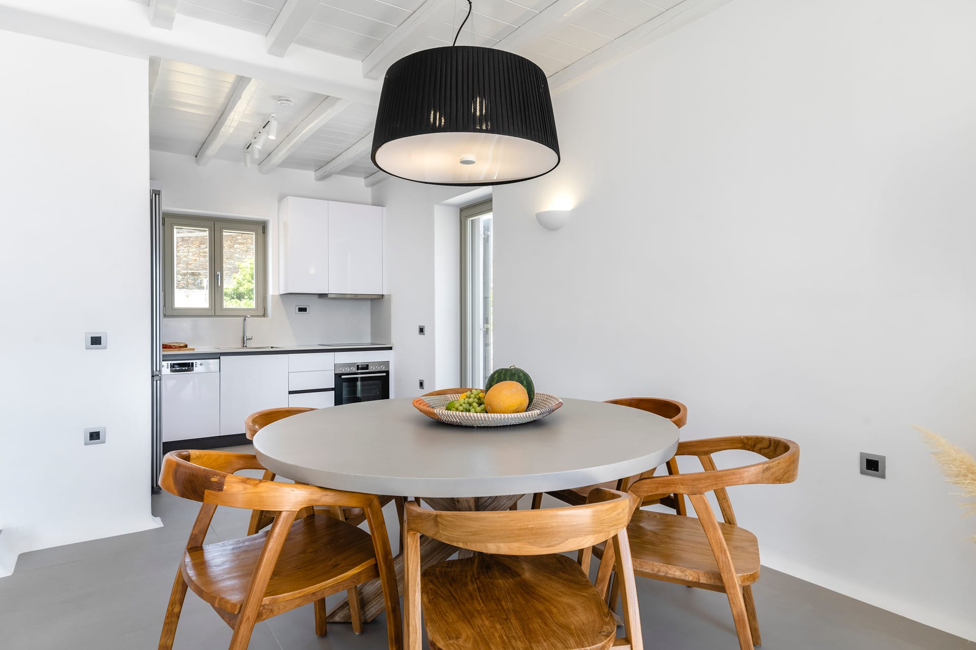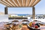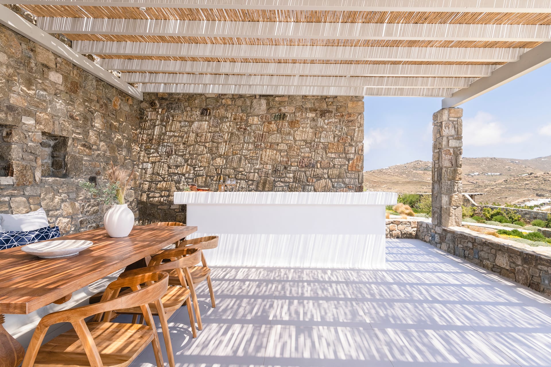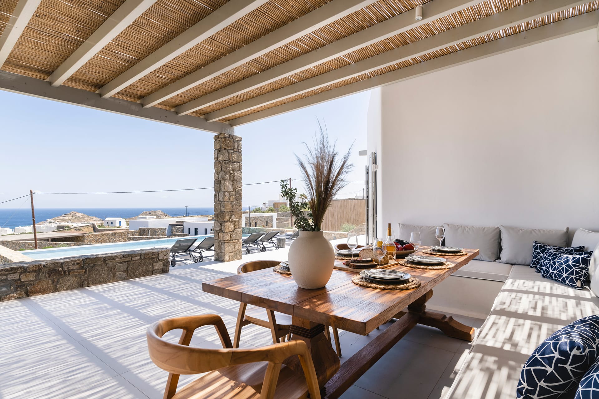 Wind-protected alfresco dining area designed for comfort even during typical Mykonos breezes.