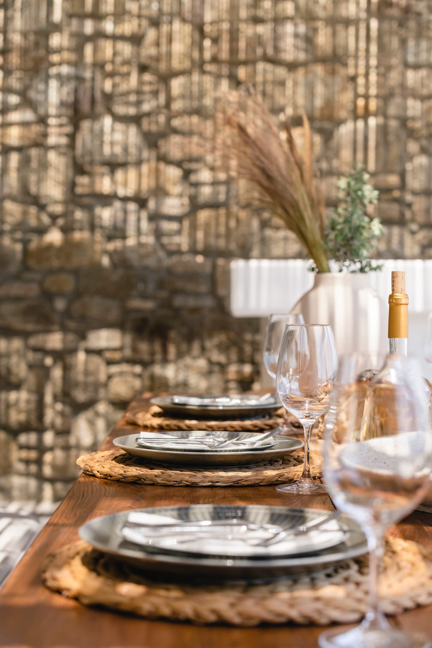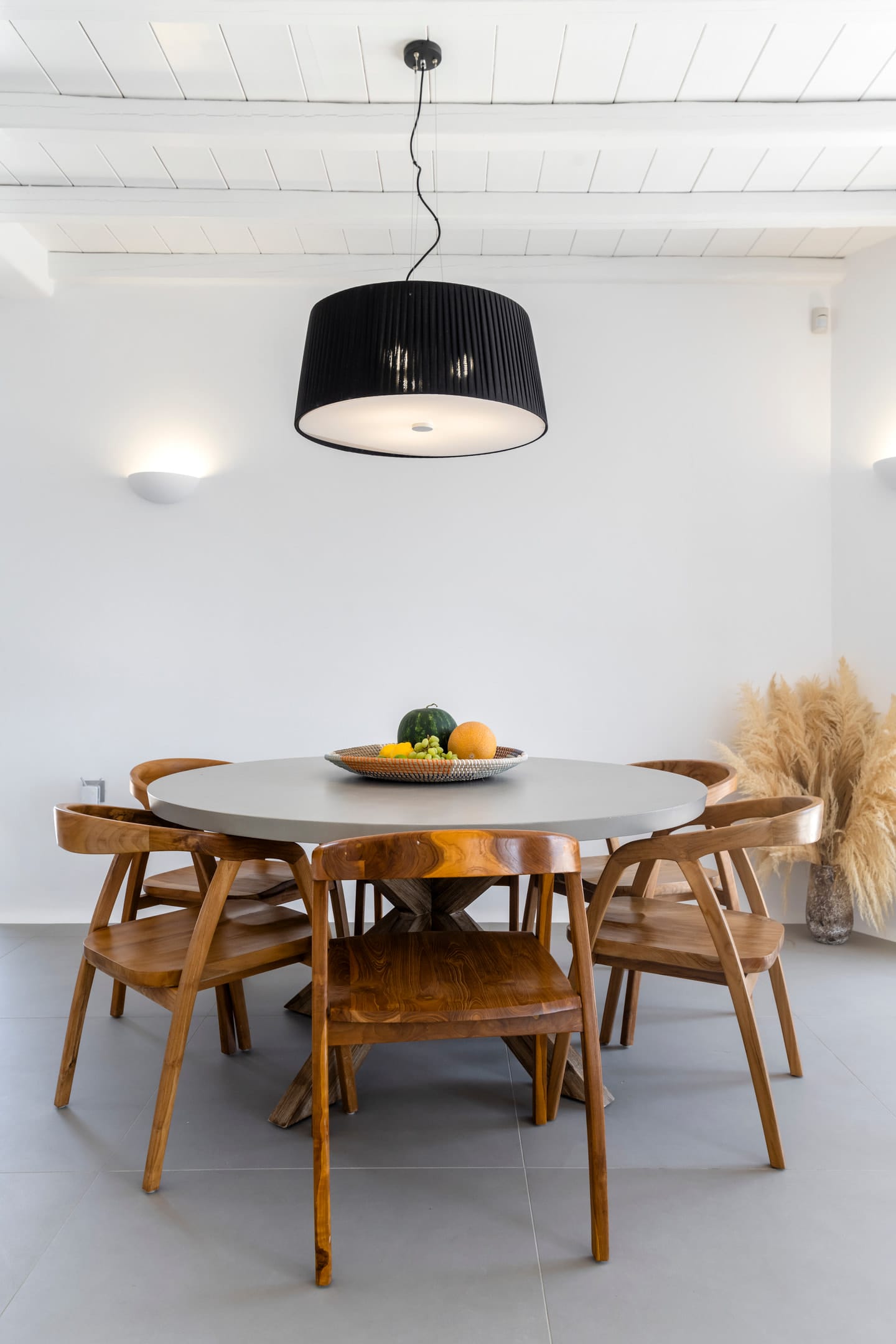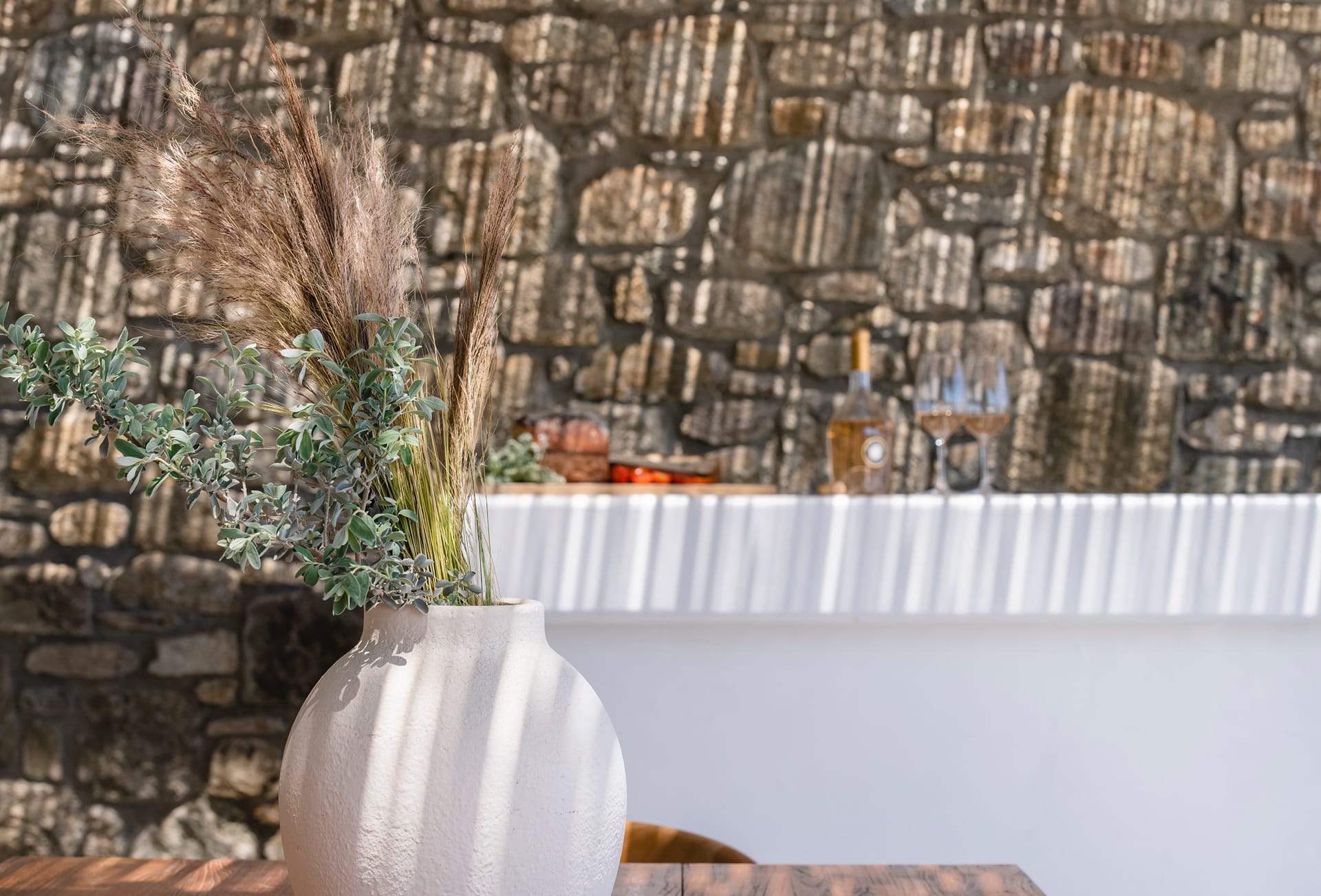 Wind-protected alfresco dining area designed for comfort even during typical Mykonos breezes.