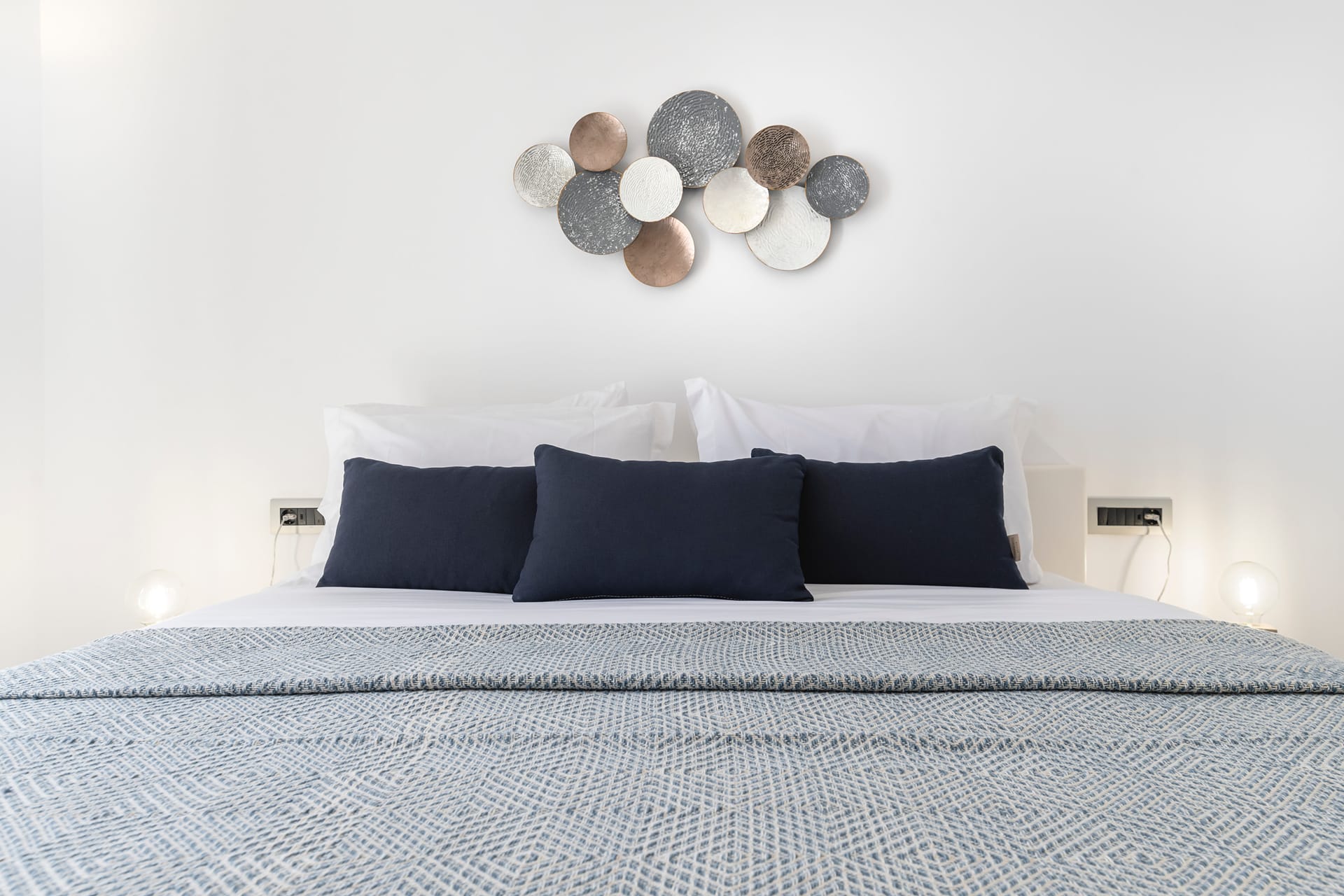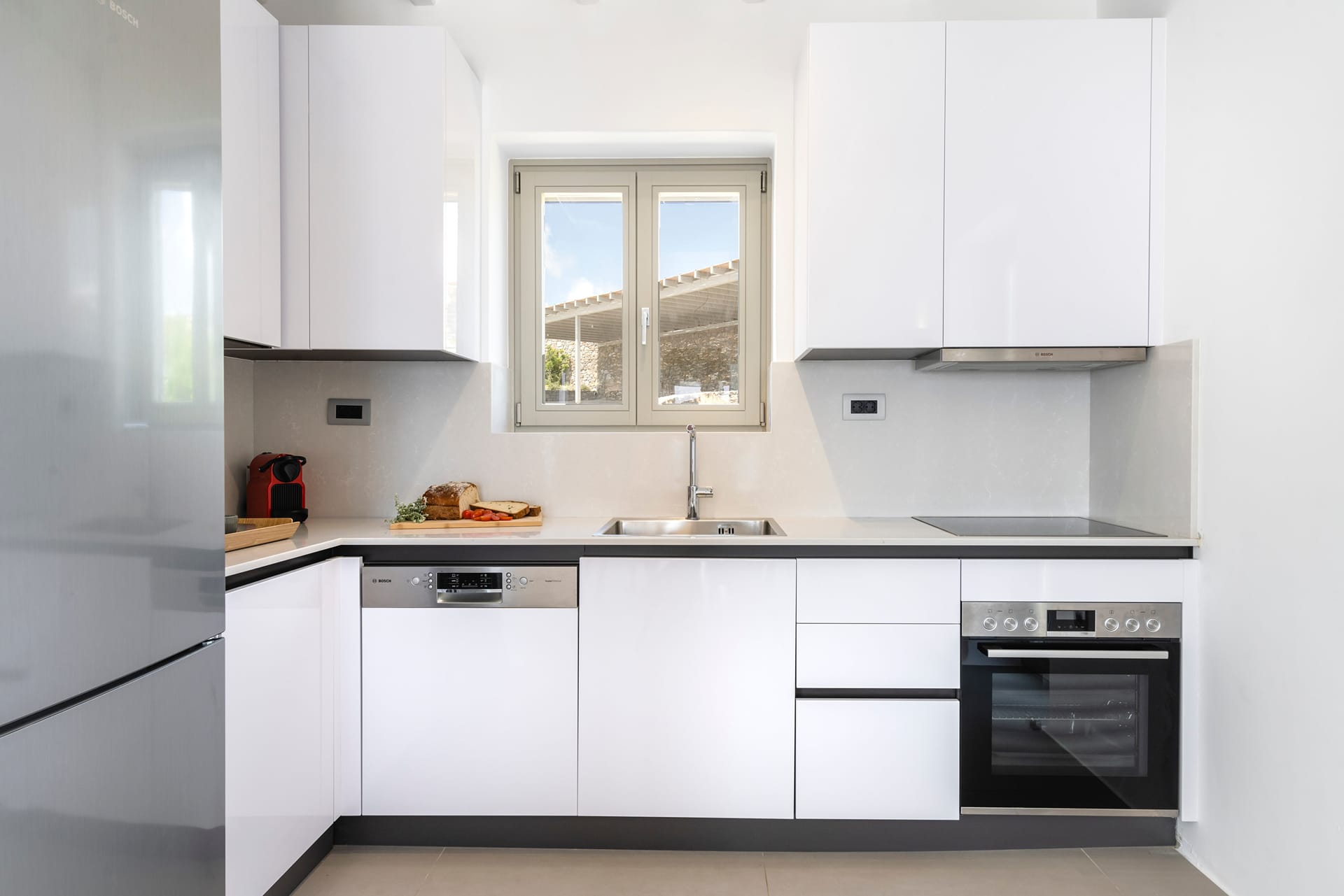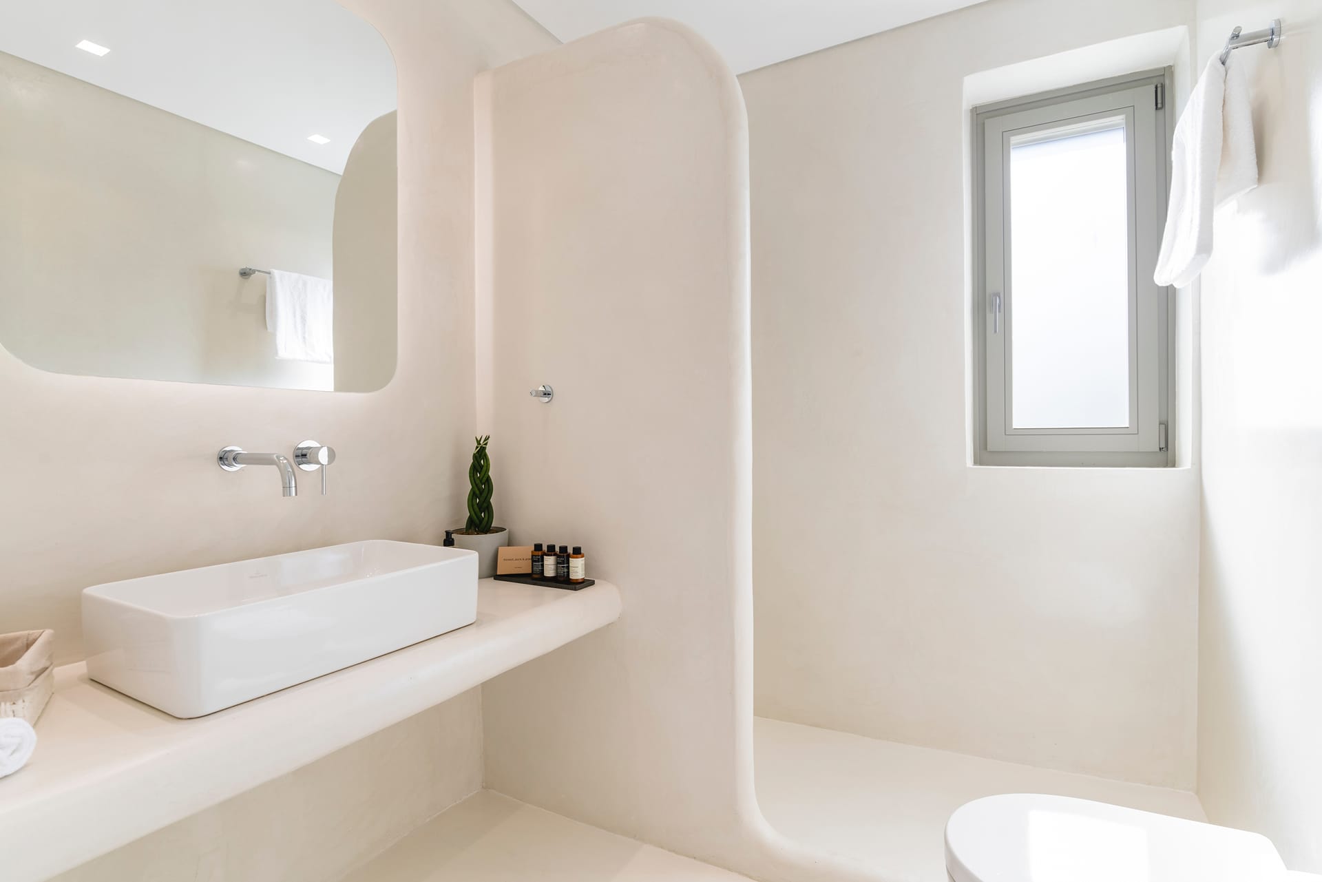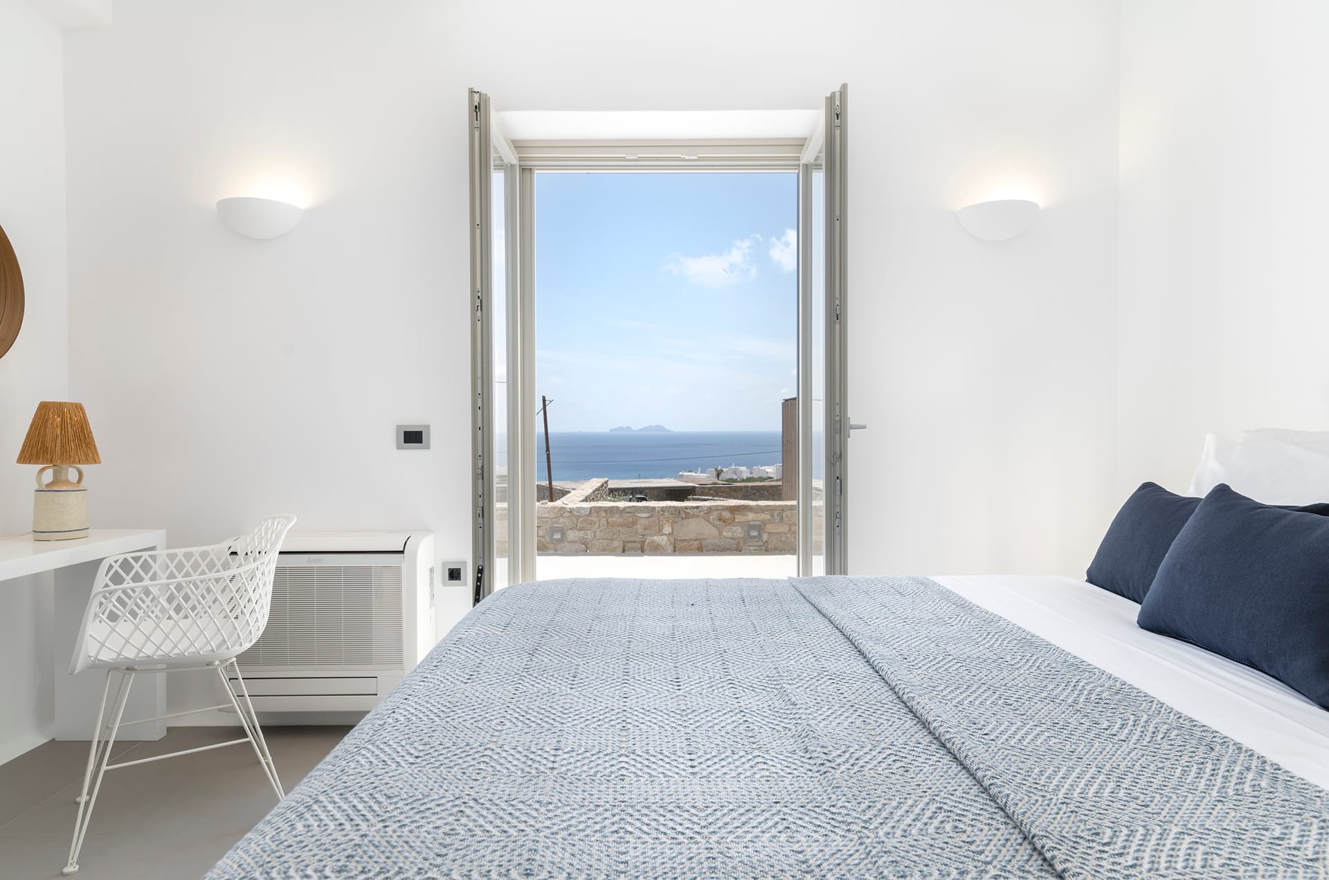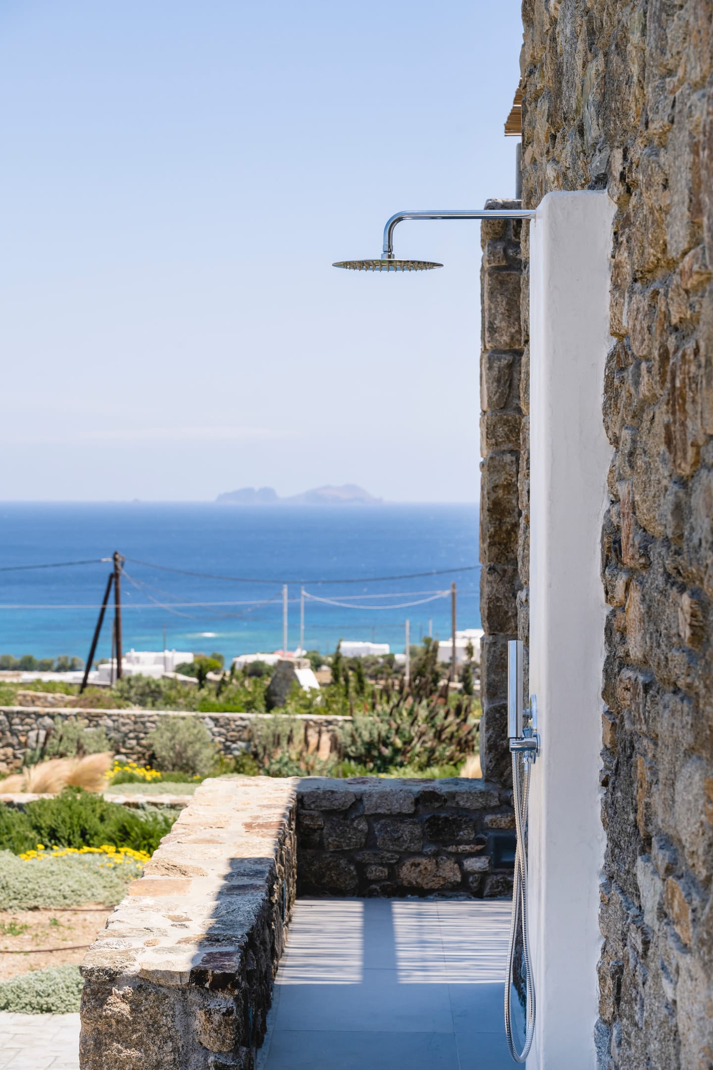 Although positioned just steps from the sea, the property enjoys privacy and tranquility, allowing guests to relax in its elegant outdoor spaces while admiring the mesmerizing views of the Aegean landscape.