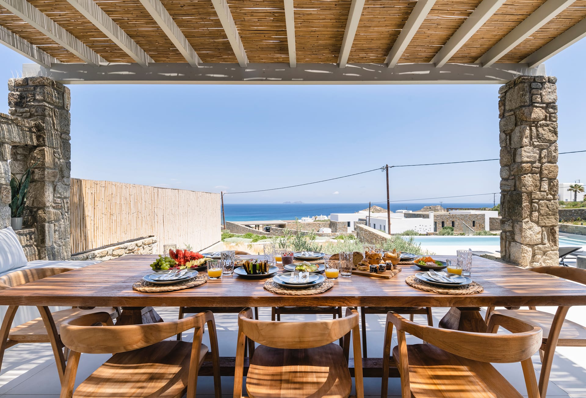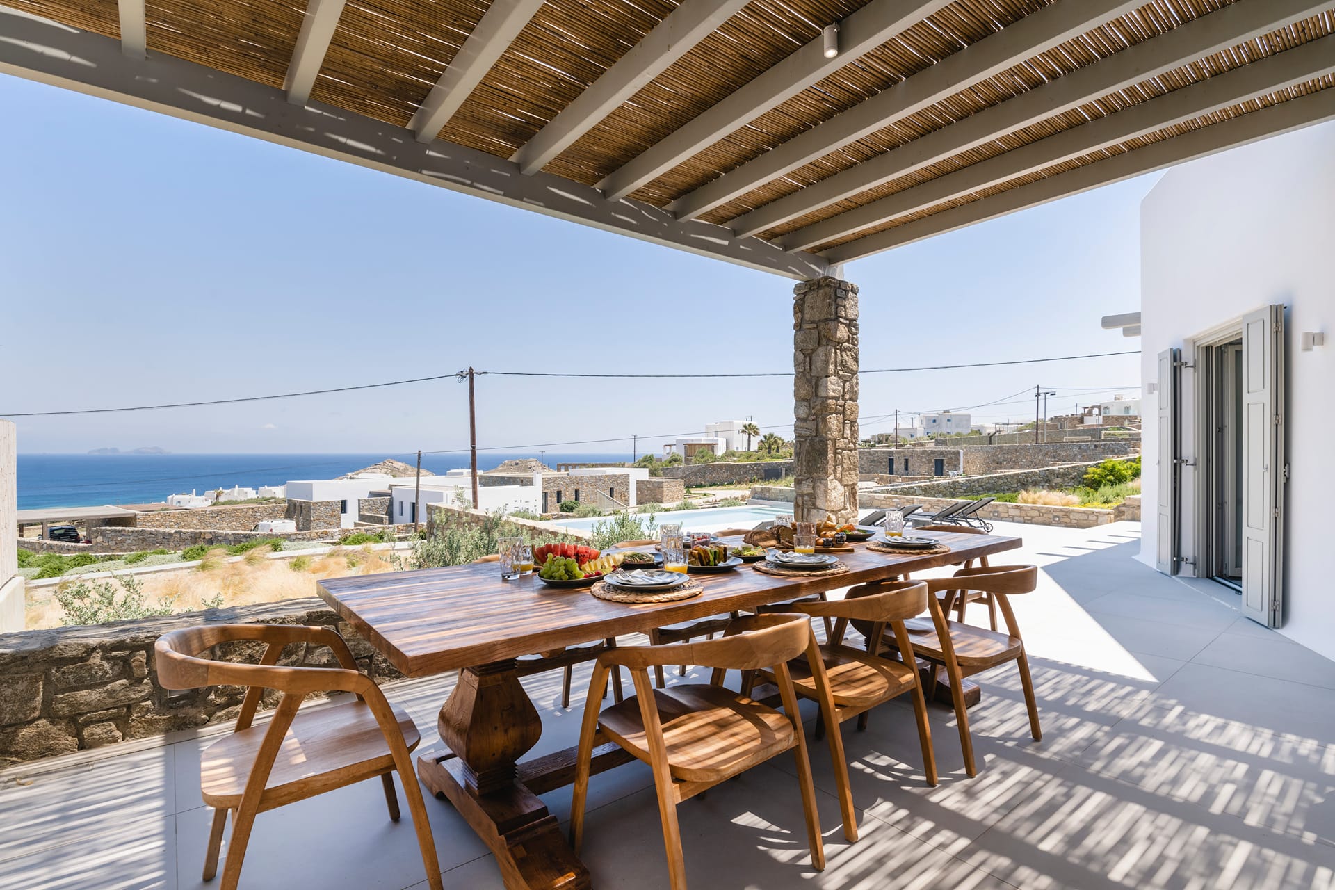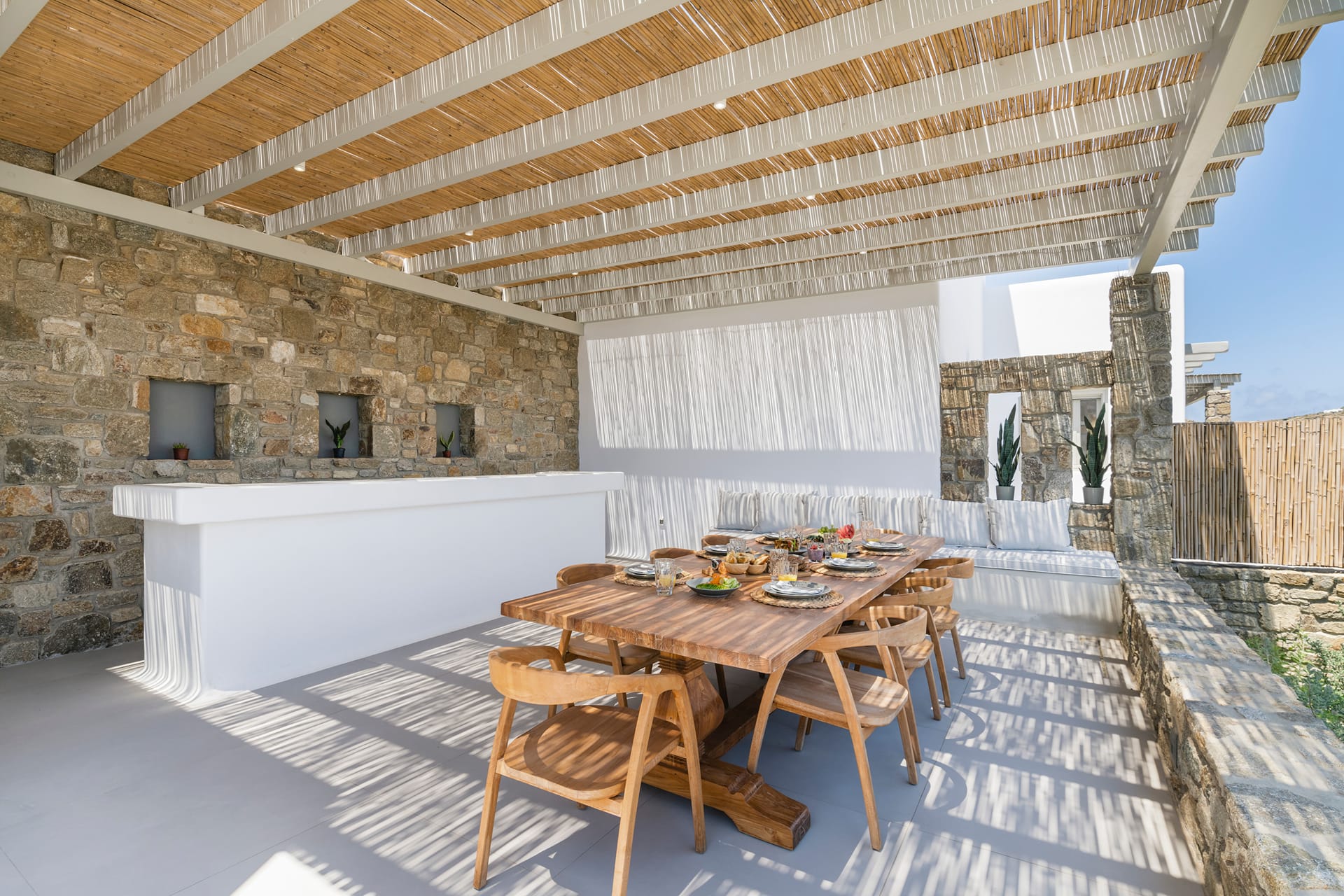 Wind-protected alfresco dining area for comfort even in typical Mykonos breezes