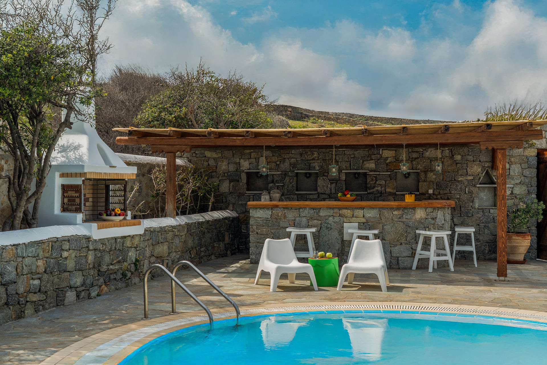 Experience authentic Mykonian charm in this traditional villa in Kalafatis. With Cycladic architecture, warm island décor, and four spacious double bedrooms, it combines timeless style with modern comfort. Step outside to a serene pool area with a shaded pergola and BBQ, perfect for alfresco dining or relaxing under the sun. Just a short stroll from the crystal-clear waters of Kalafatis Beach, this villa is ideal for families or friends seeking a peaceful Greek seaside escape.