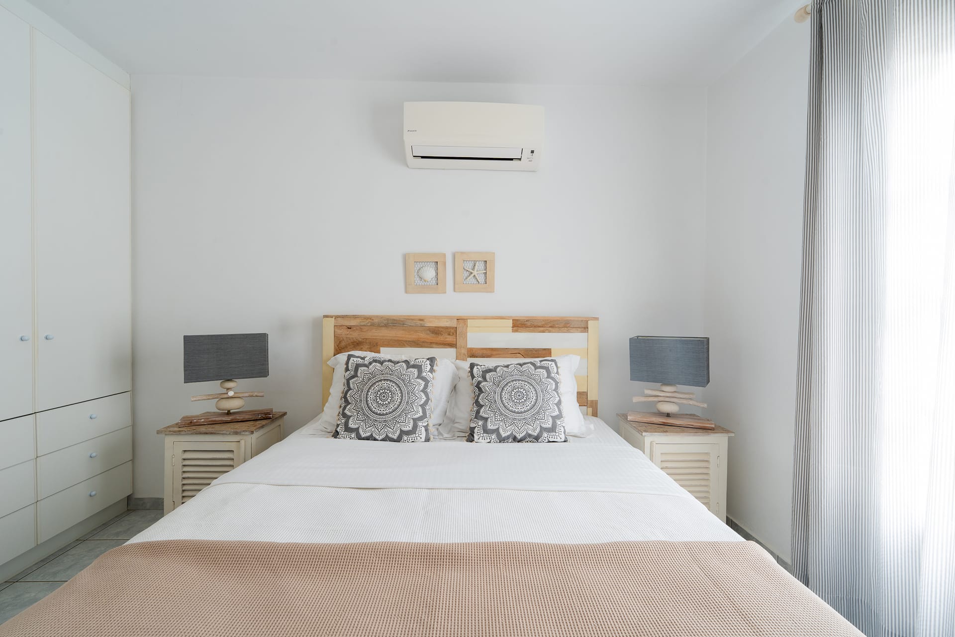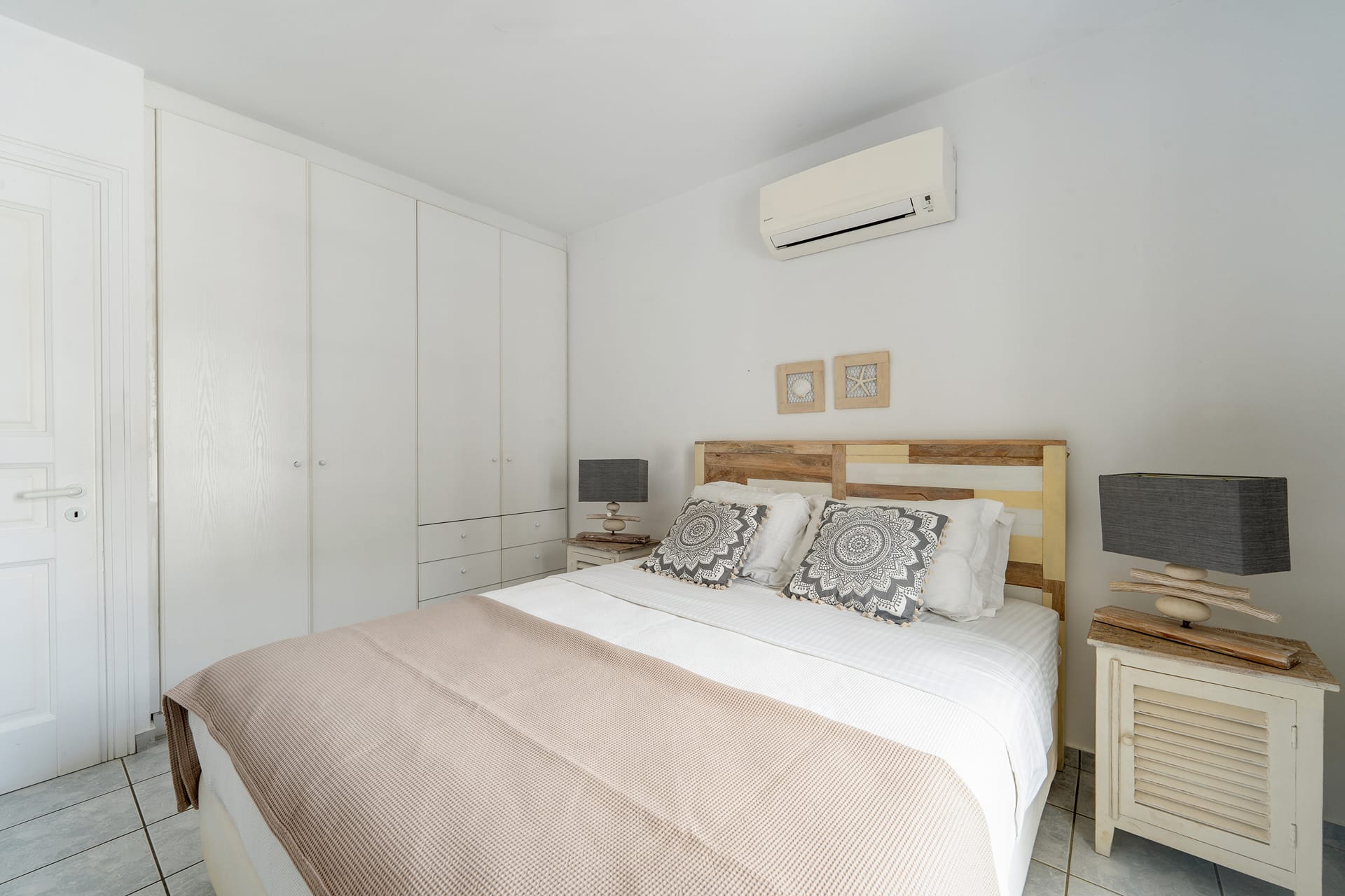 1 Double bedroom with queen-sized bed and private bathroom; equipped with AC, wardrobe, safe box, and direct Aegean Sea views