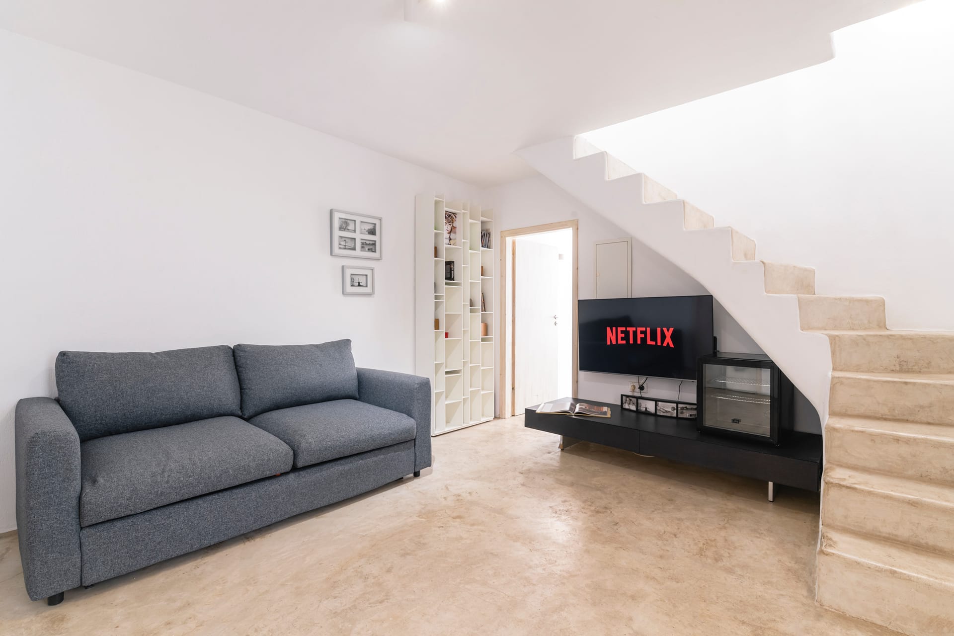 Spacious living room with fully equipped open-plan kitchen.