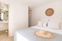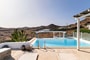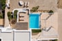 This contemporary 105 sqm Mykonian home features a private pool, three master bedrooms with en-suite bathrooms, a stylish open-plan kitchen and living area, and an expansive outdoor patio designed for relaxation and entertaining.