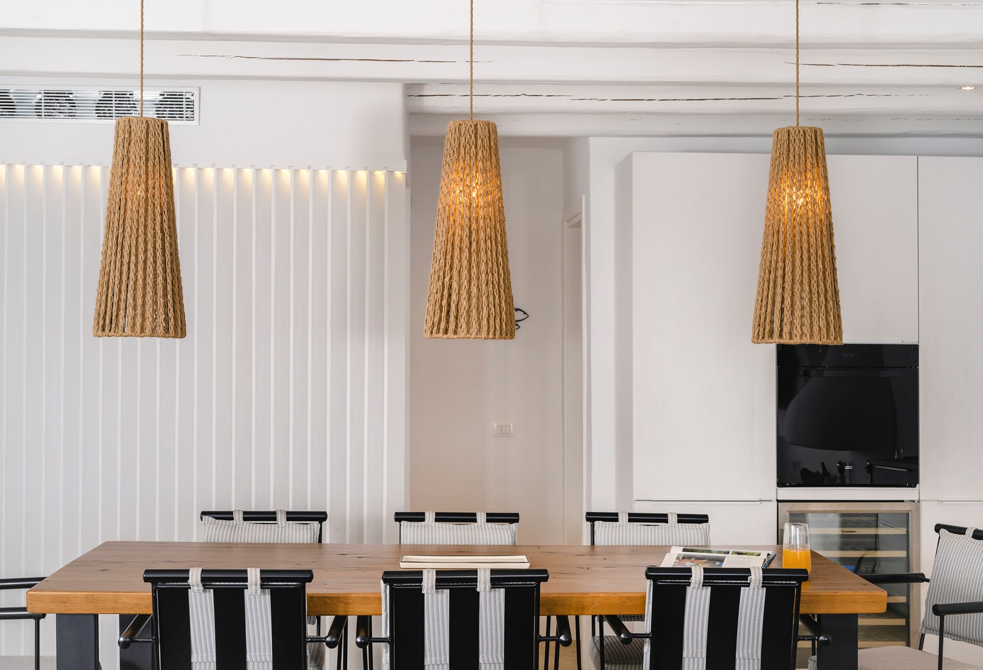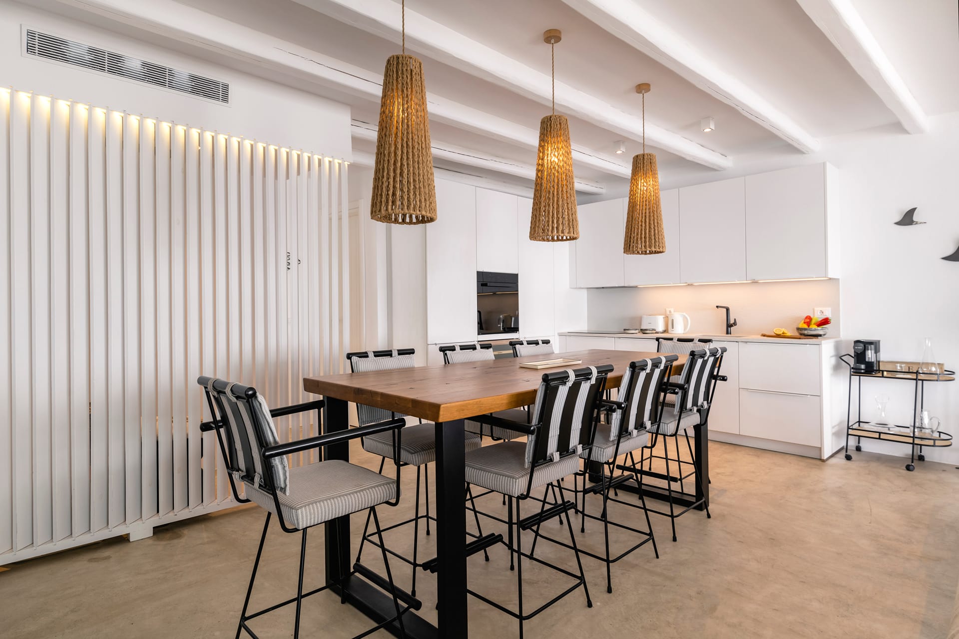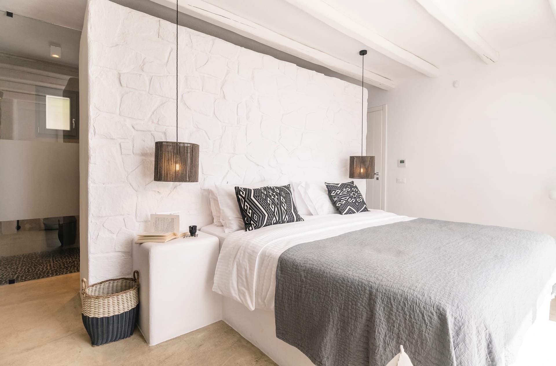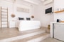 Recently fully renovated, Villa Paoli showcases modern Mykonian interior design combined with high-end furnishings, offering a serene and luxurious oasis. The villa accommodates up to 8 guests across 4 fully independent bedrooms, each with an en-suite bathroom and distinctive style. The living and dining areas, along with the open-plan fully equipped kitchen, open directly onto the pool terrace, seamlessly blending indoor and outdoor living.