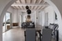 Villa Lomas is a spacious six-bedroom villa set in Paradisia, Tourlos, offering stunning views of Mykonos Town and breathtaking sunsets. The outdoor terrace features a curved lounge around a circular table and a shaded al fresco dining area, creating the perfect transition from indoor to outdoor living. The villa’s minimalist, elegant style flows indoors, where traditional Cycladic elements are paired with carefully chosen darker furnishings for a refined and comfortable atmosphere.