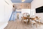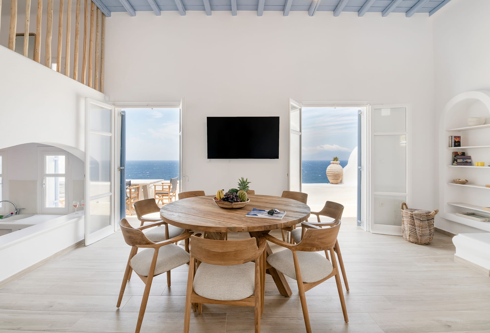The upper level features a bright dining and lounge area, along with a fully equipped kitchen. Large openings lead to a spacious balcony with panoramic sea and sunset views.