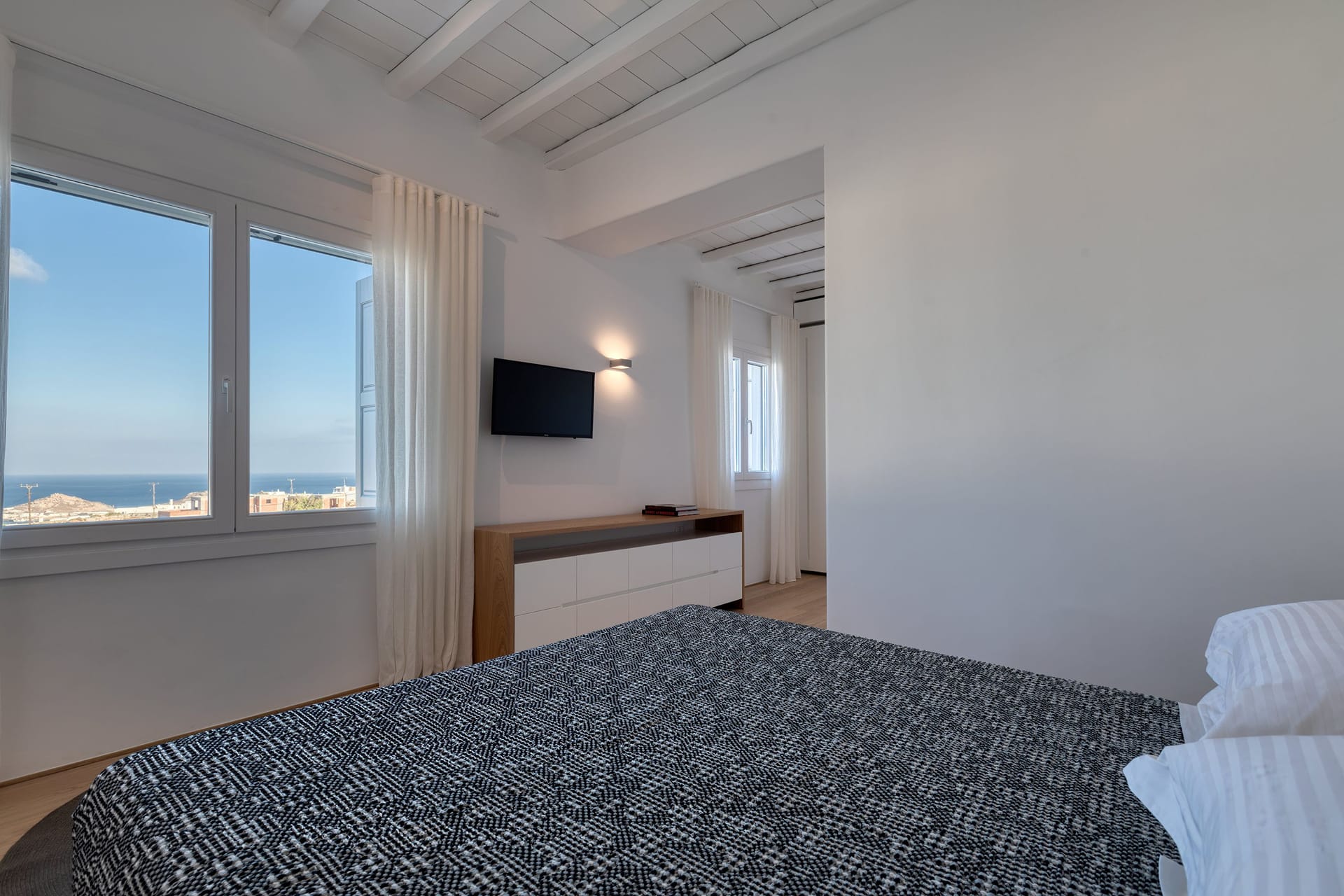 The villa’s outdoor spaces are designed for complete relaxation, where guests can enjoy uninterrupted views over the bays of Kalafatis and Kalo Livadi. Whether enjoying the pool during the day or relaxing in the Jacuzzi under the full moon, the villa offers a peaceful and exclusive atmosphere.