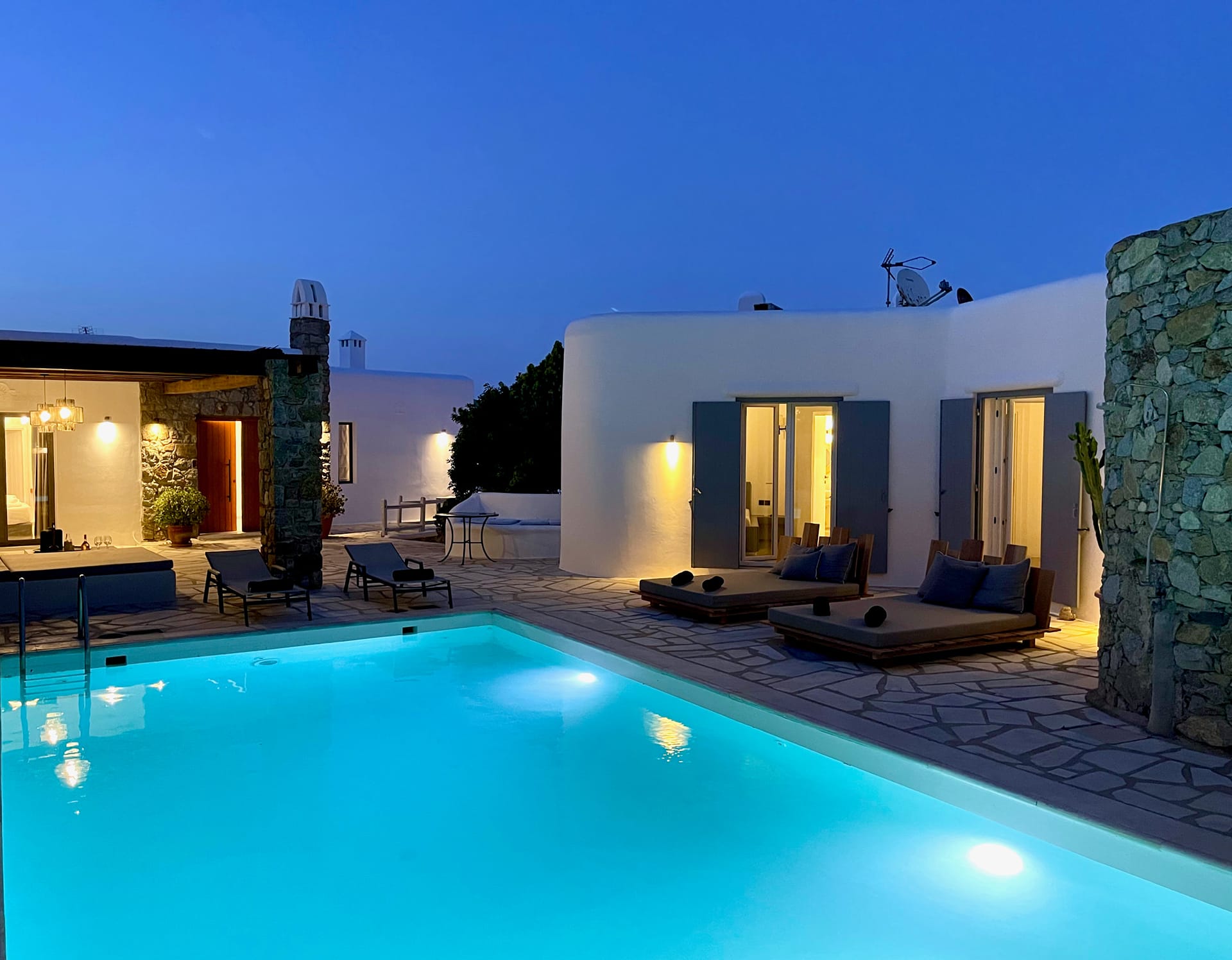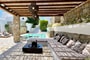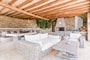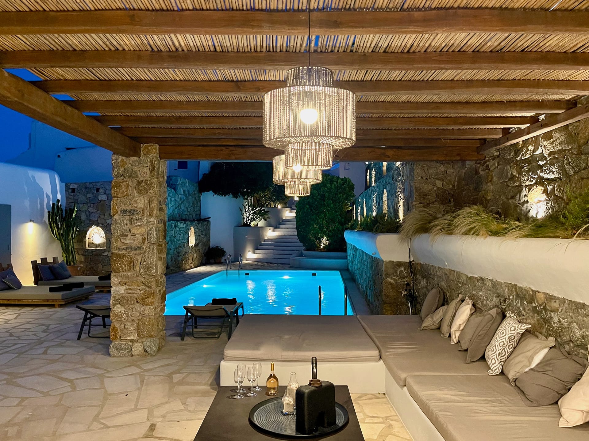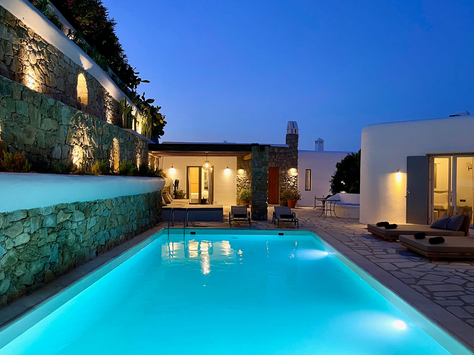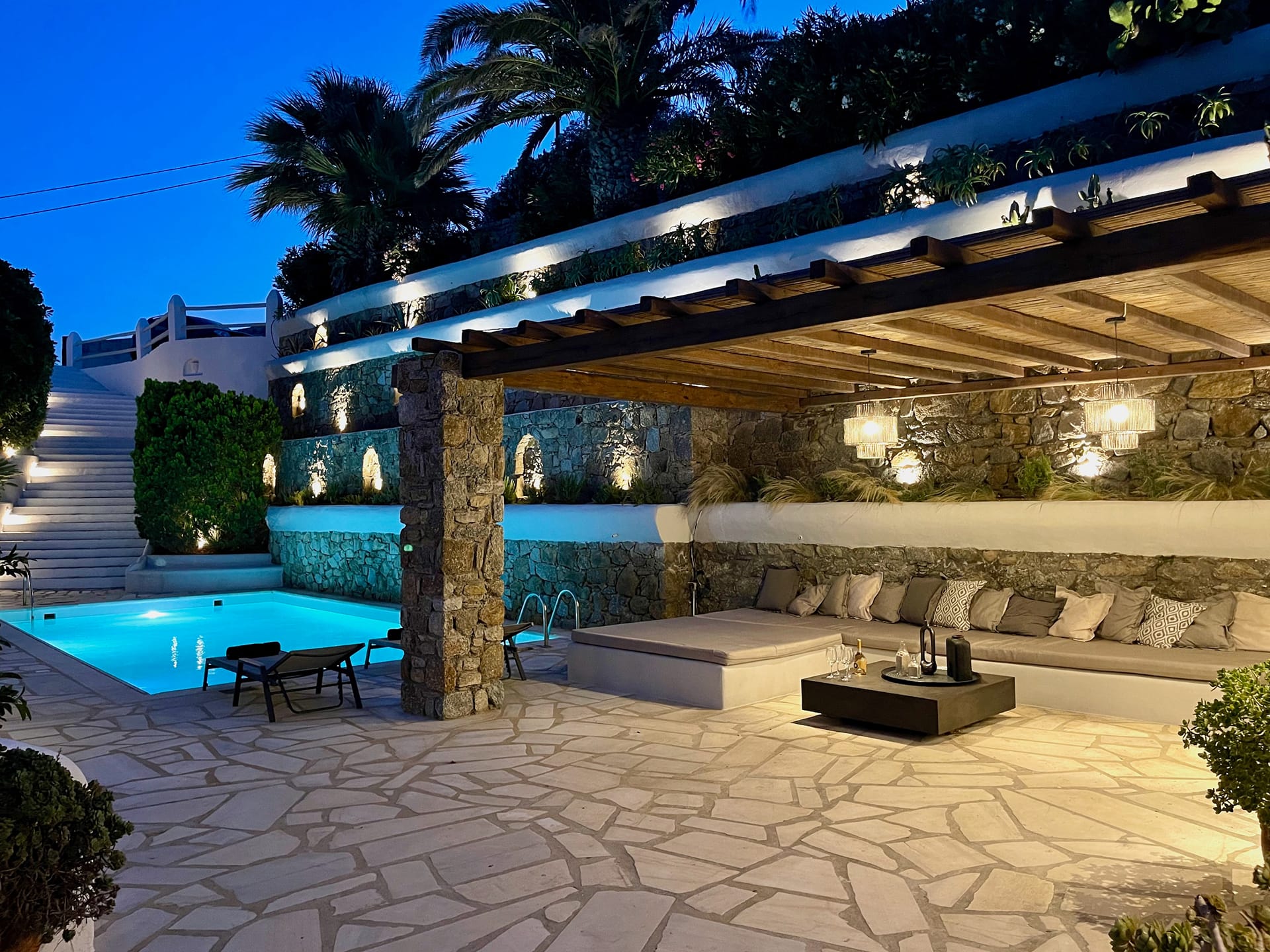 Guests can enjoy open-air living around the pool, with multiple lounging and dining areas under pergolas or beneath the starry sky. The villa is composed of a two-level main house plus two independent guest houses, accommodating up to 14 guests comfortably across seven en-suite bedrooms.