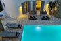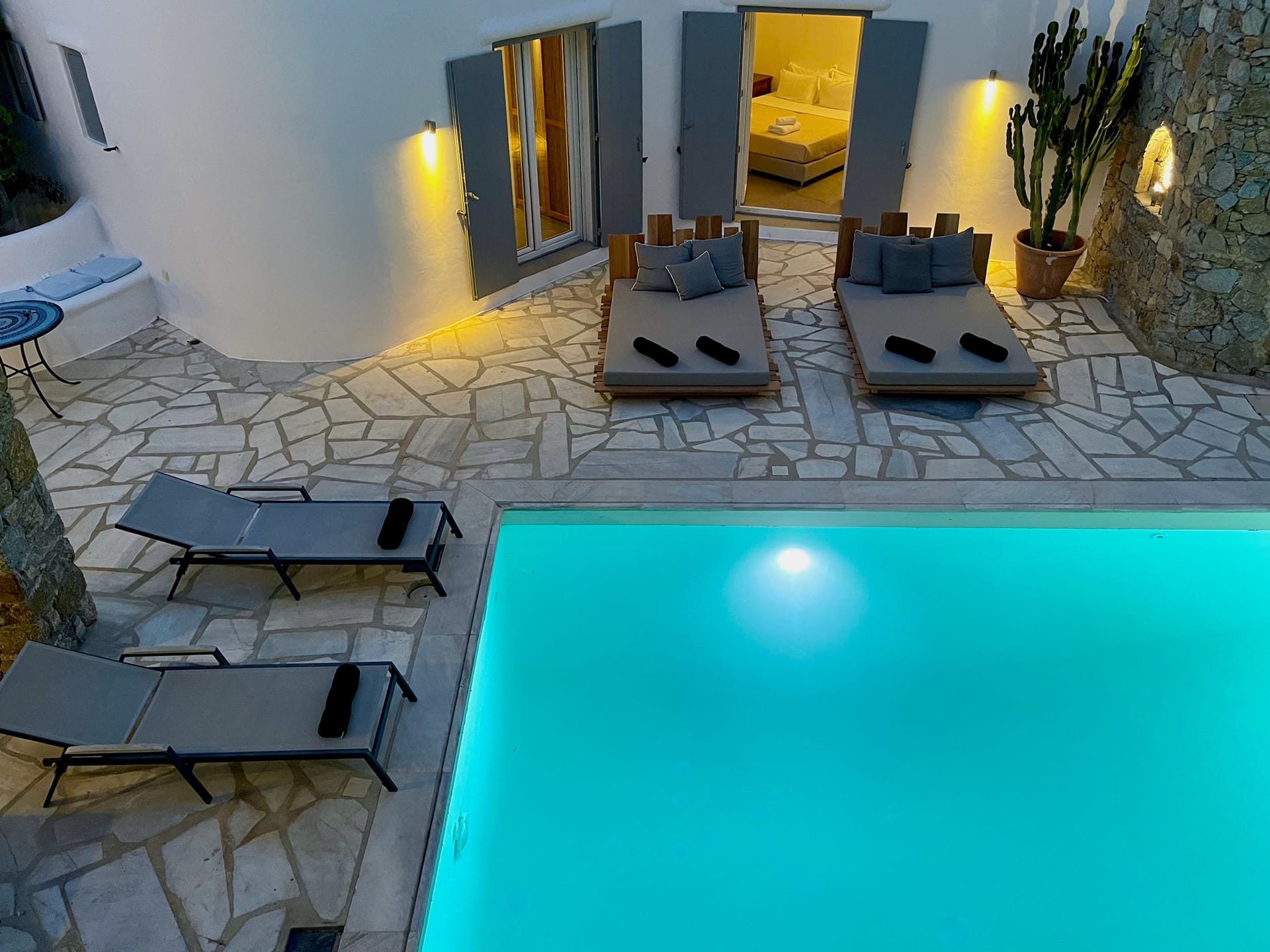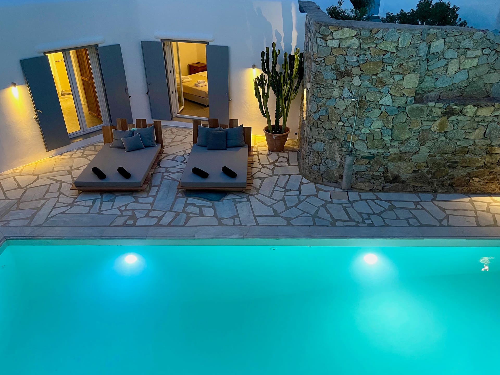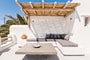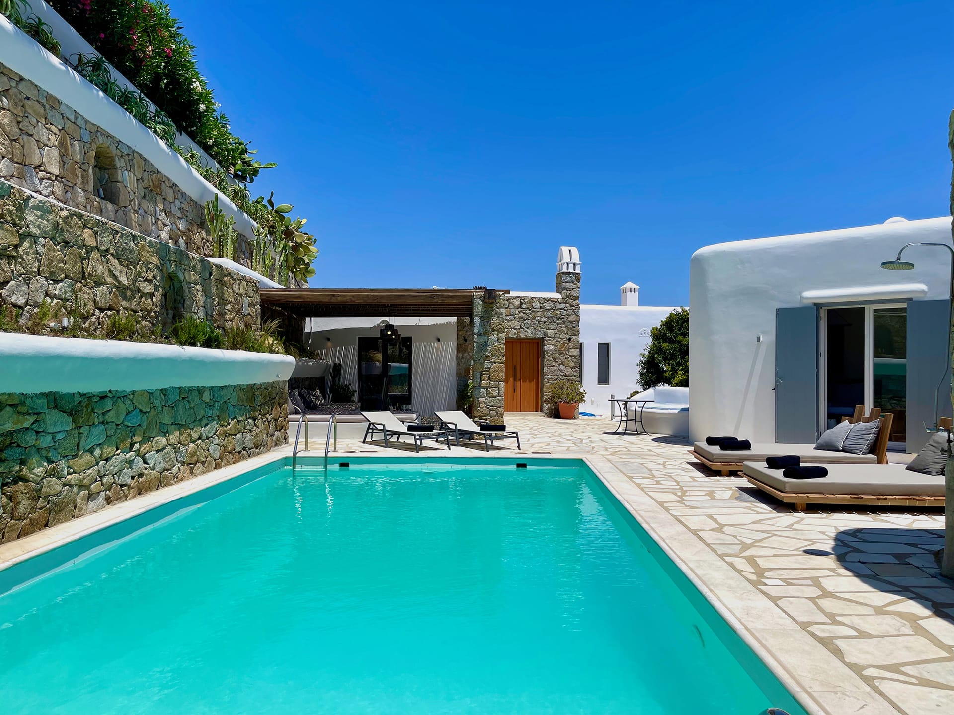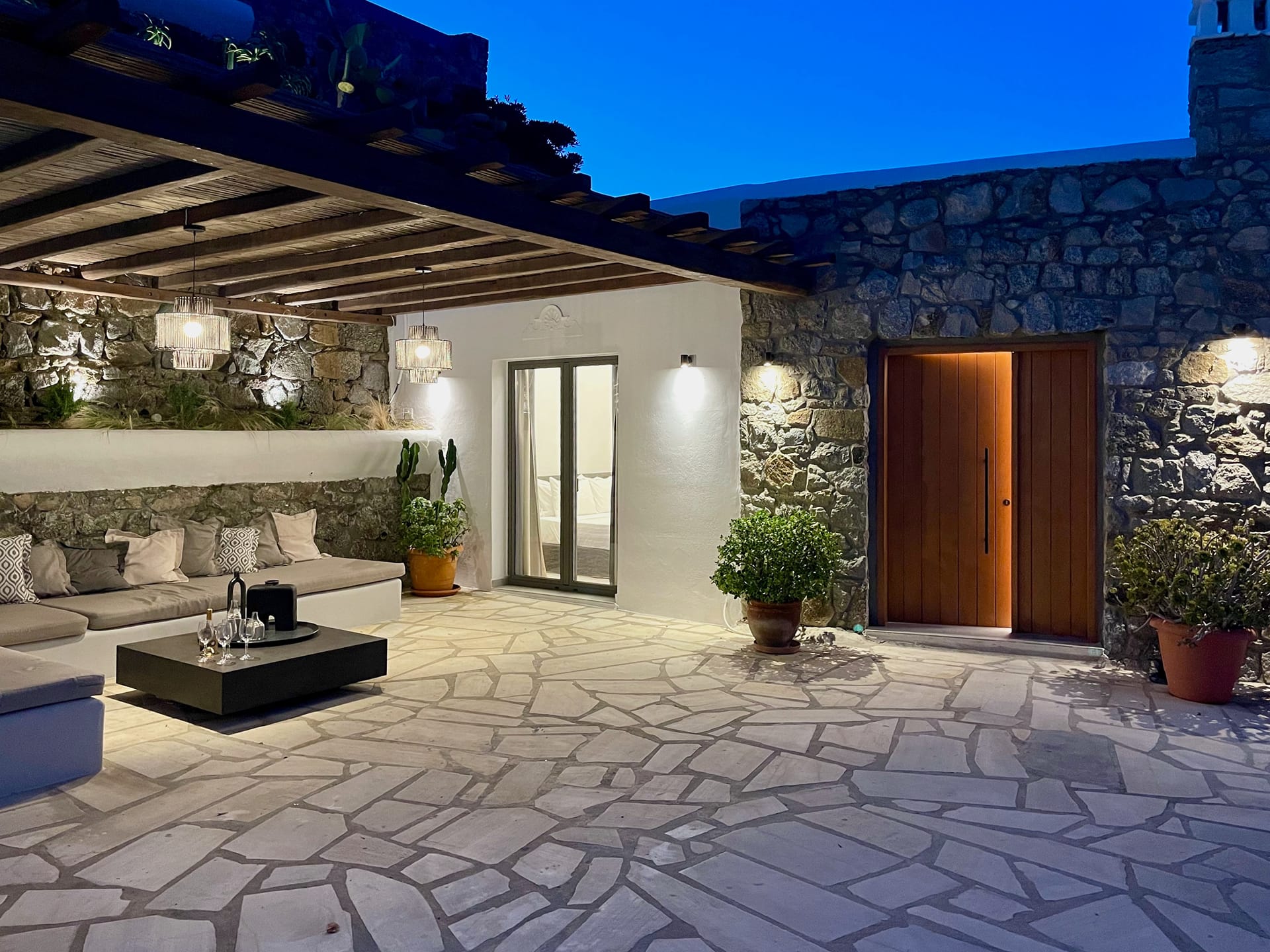 Guests can enjoy open-air living around the pool, with multiple lounging and dining areas under pergolas or beneath the starry sky. The villa is composed of a two-level main house plus two independent guest houses, accommodating up to 14 guests comfortably across seven en-suite bedrooms.